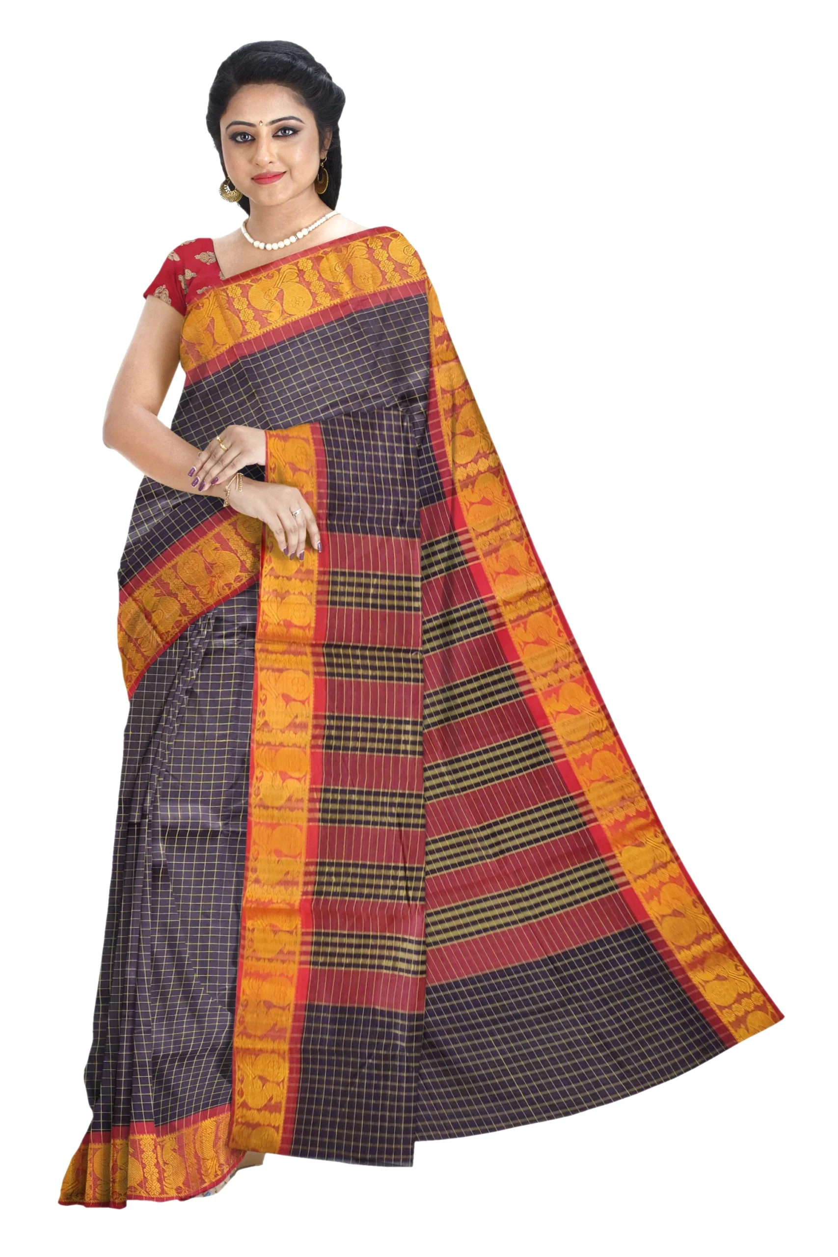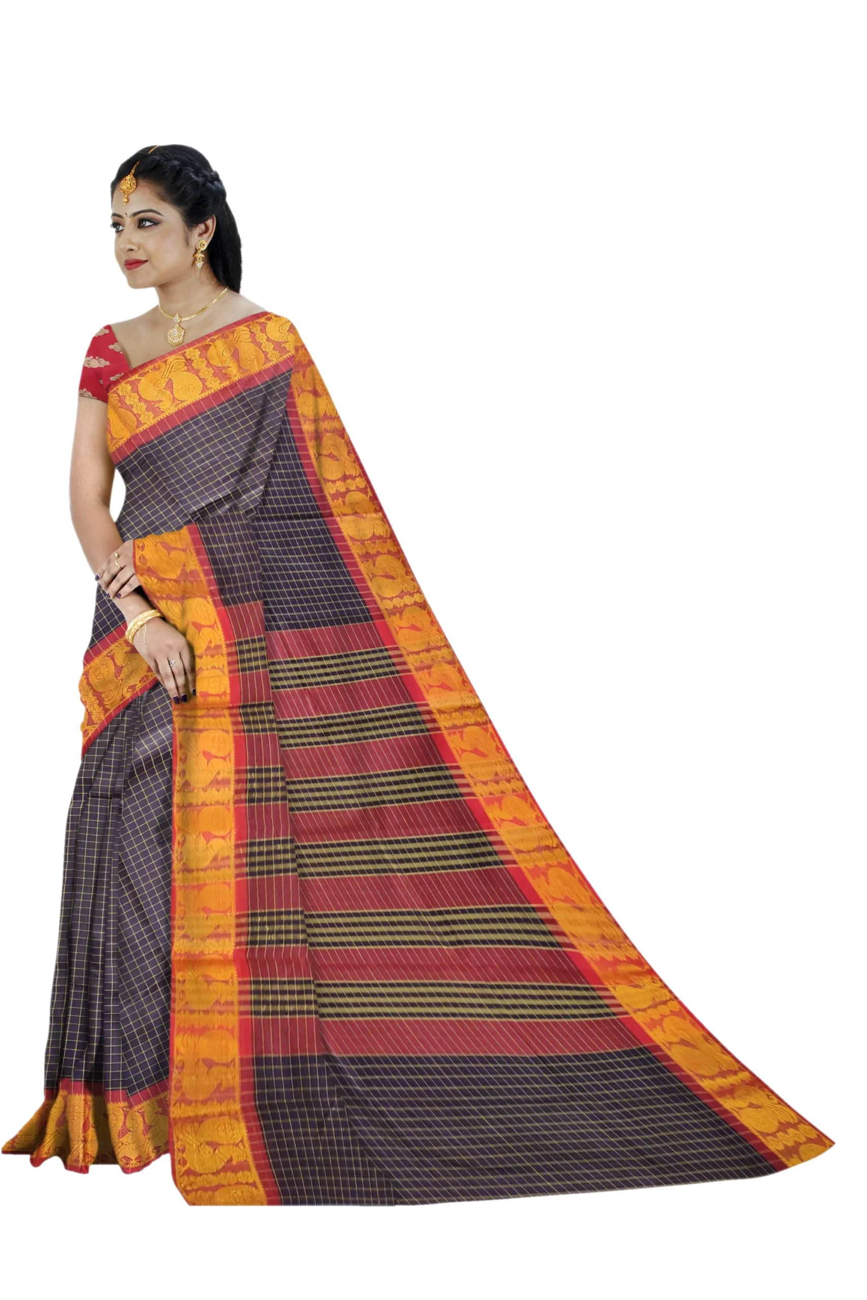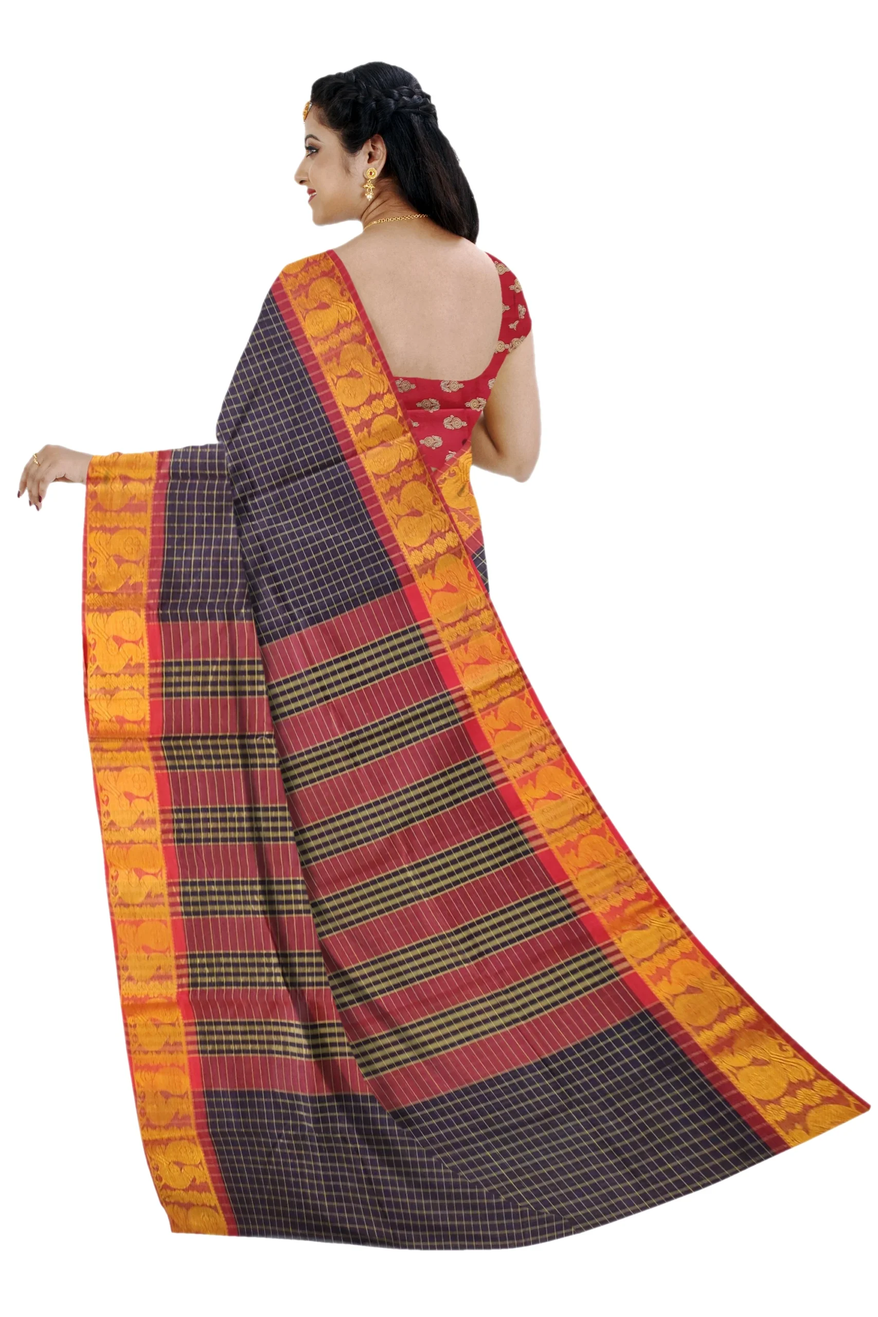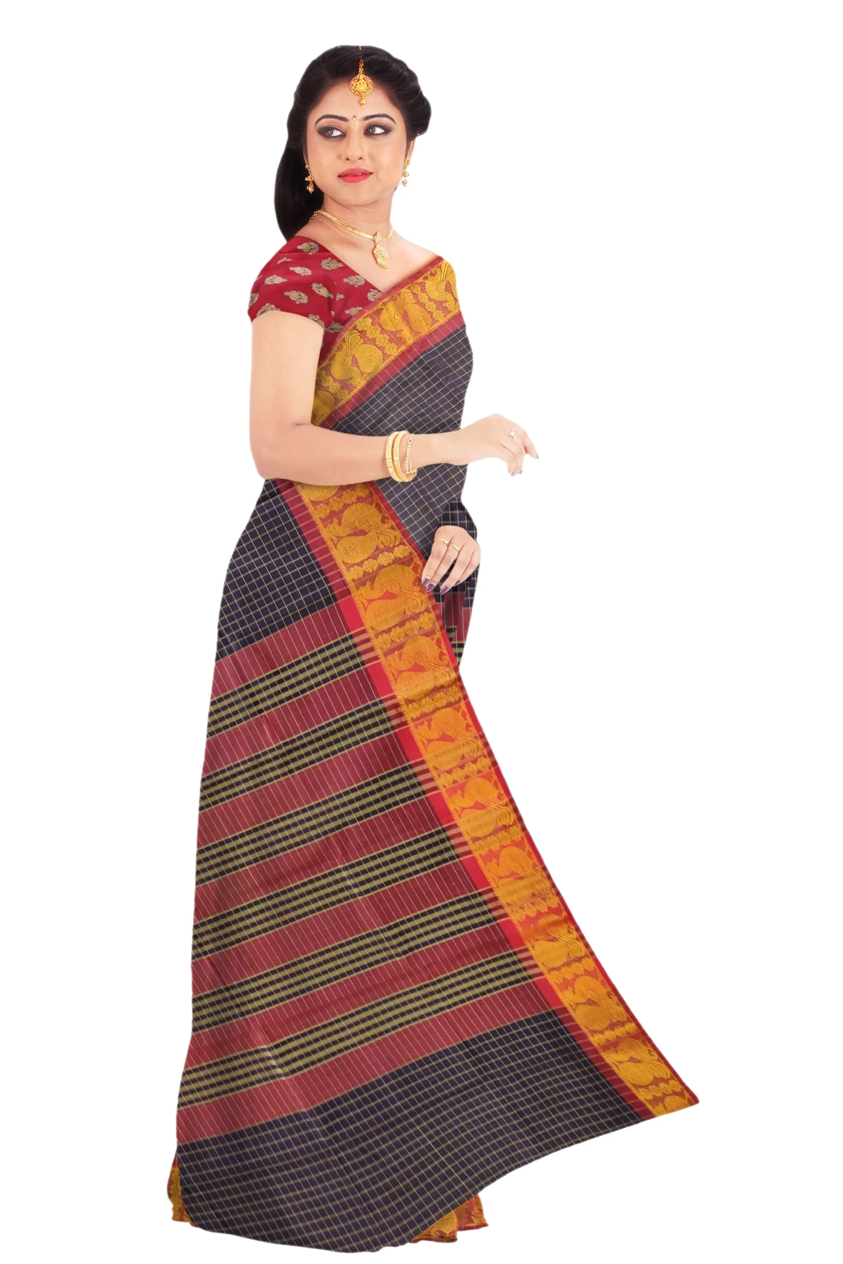 This saree comes in a deep navy blue colour, a shade that symbolizes sophistication and elegance. The saree body features a traditional checked pattern, which is one of the signature elements of authentic Chettinad cotton sarees from Tamil Nadu. The fine checks give the saree a neat and structured look while maintaining the classic charm that Chettinad sarees are known for.