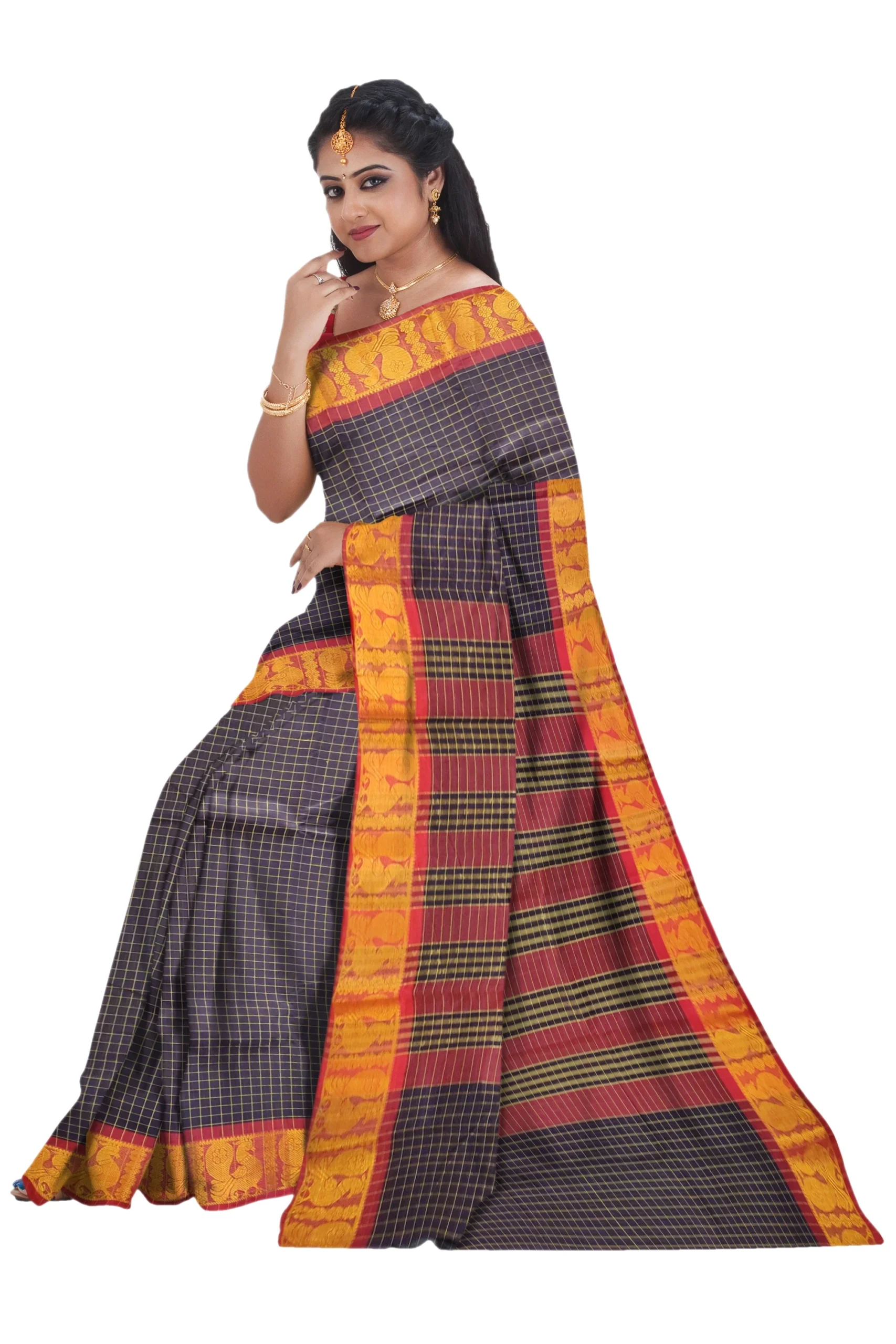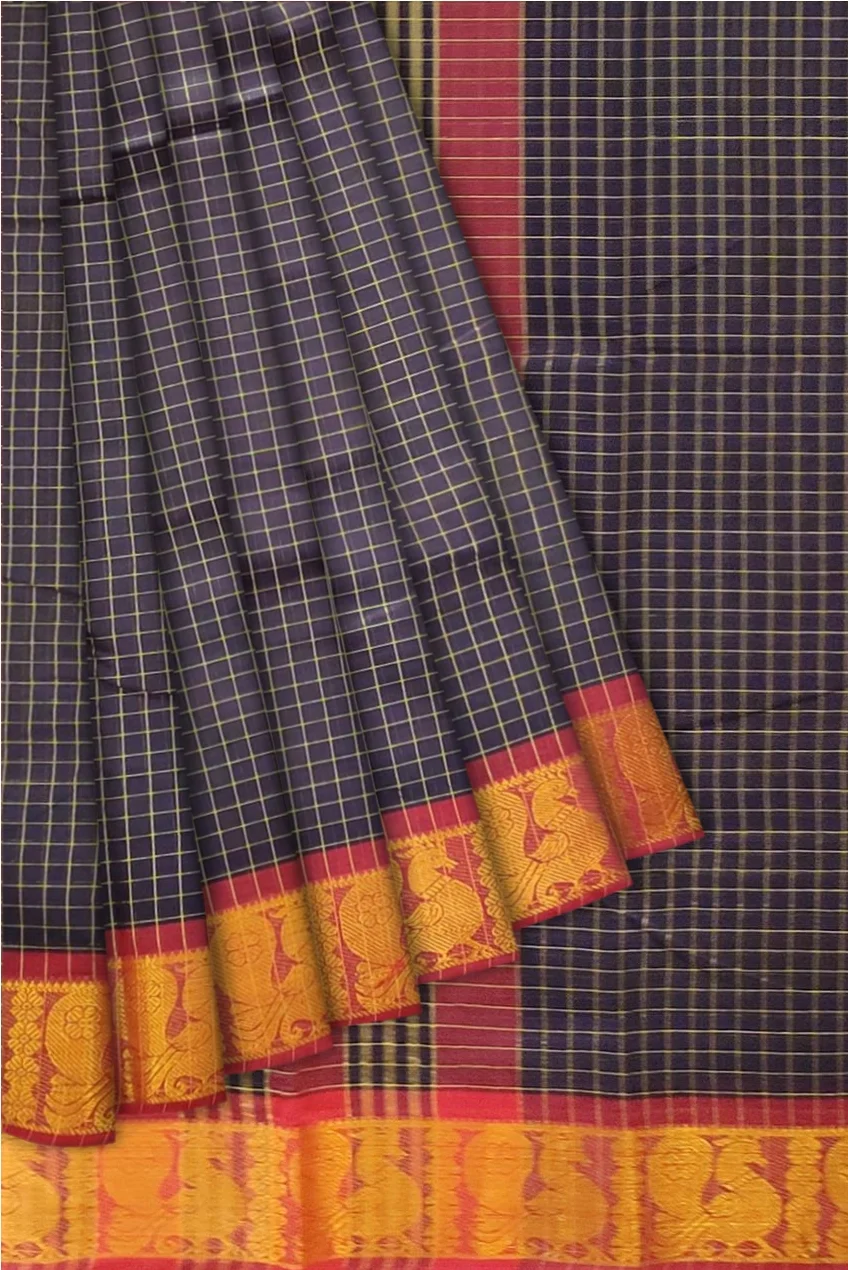 If you are searching online for Chettinad cotton checked sarees with zari border, this elegant navy blue saree is an excellent choice. Its breathable cotton fabric, classic checked pattern, and luxurious peacock zari border make it a timeless saree that you can wear on many occasions.