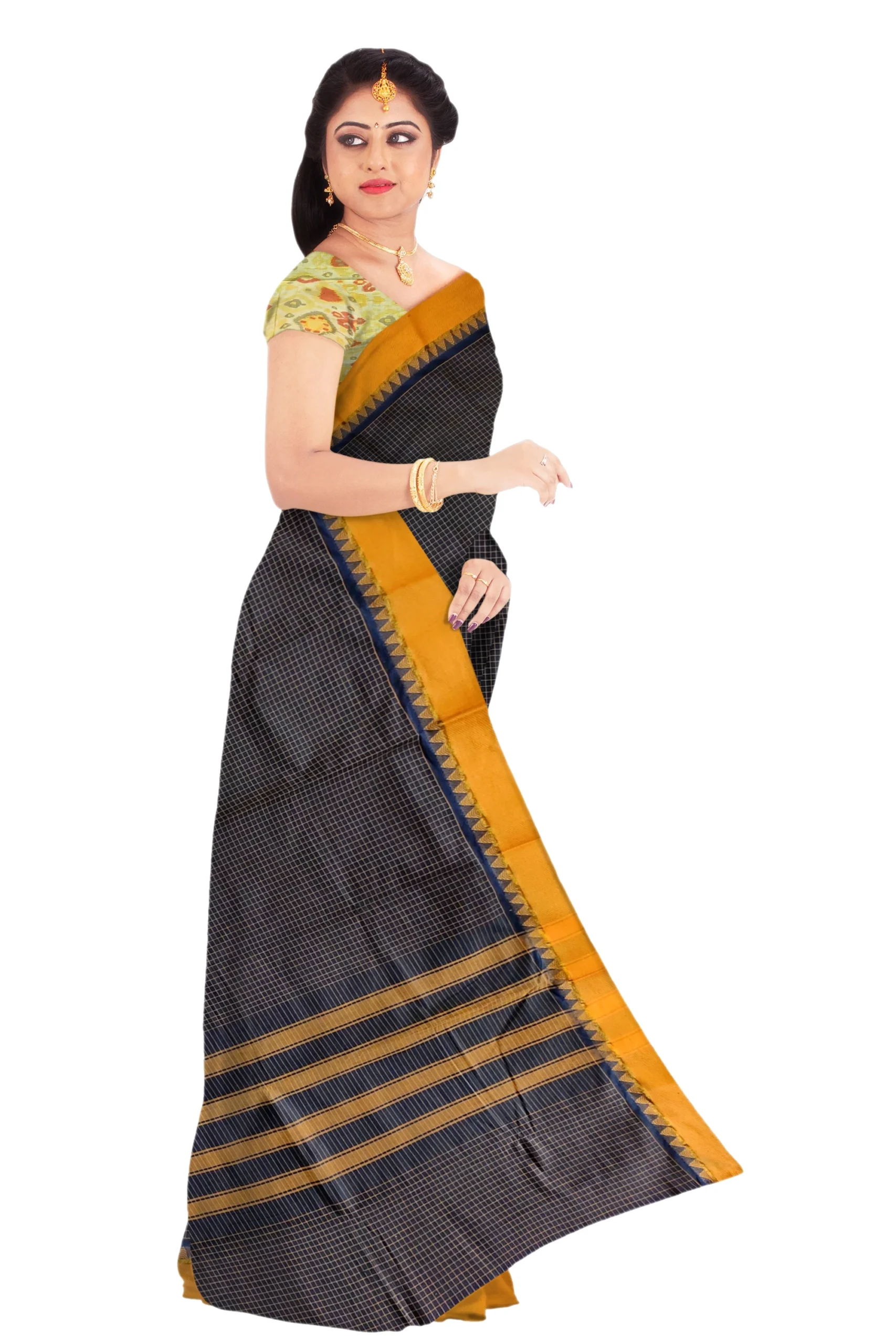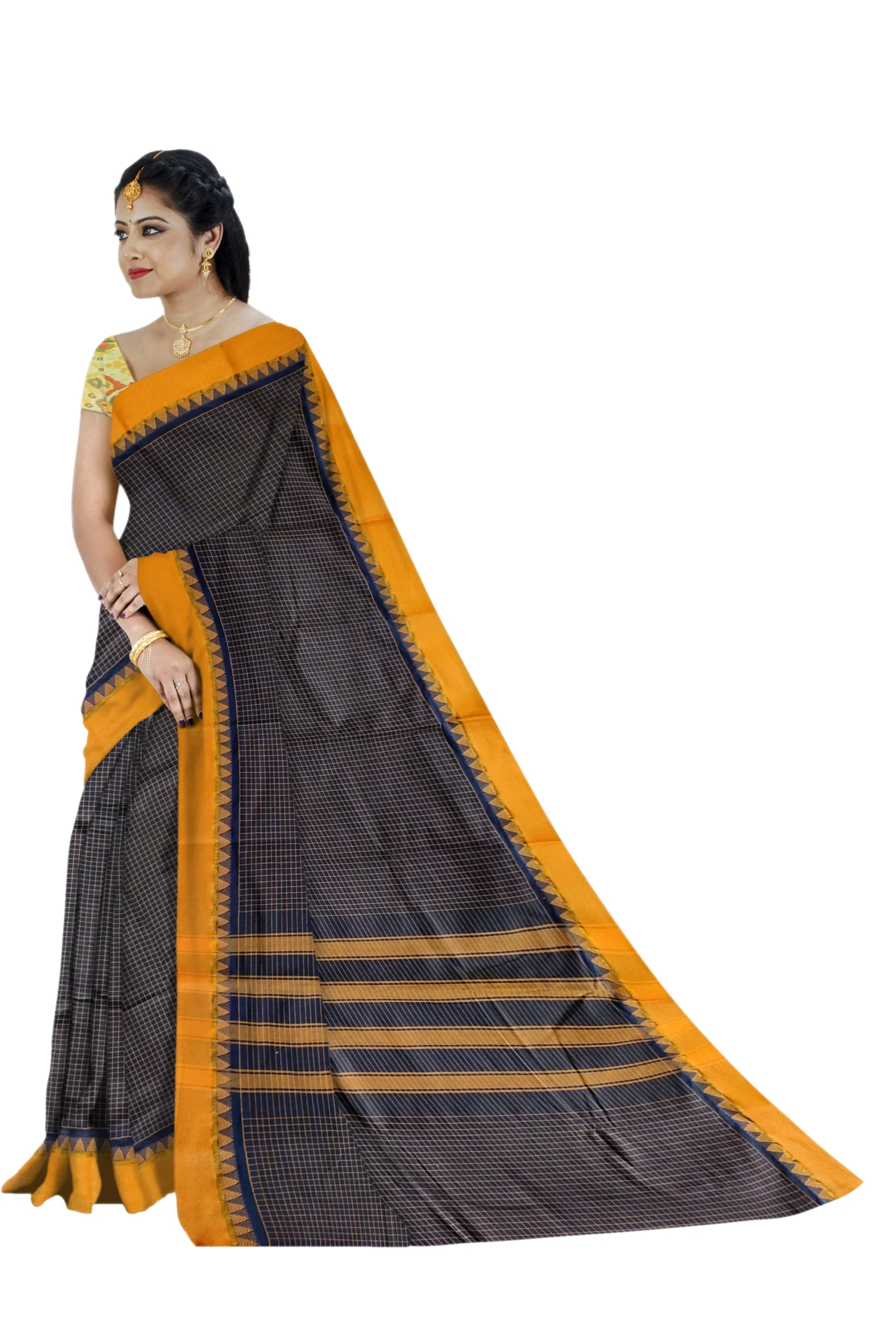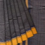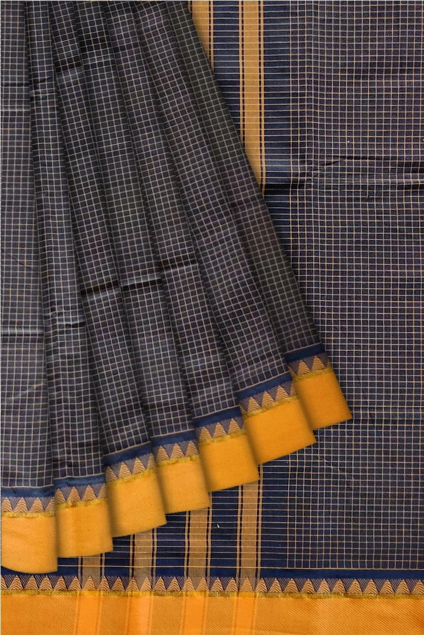 This saree features a stylish navy blue colour with a traditional checked pattern across the body, giving it a sophisticated and graceful appearance. Checked designs are a signature feature of Chettinad cotton sarees and are loved for their timeless appeal. The small check pattern adds a refined texture to the saree while maintaining its elegant and traditional style.