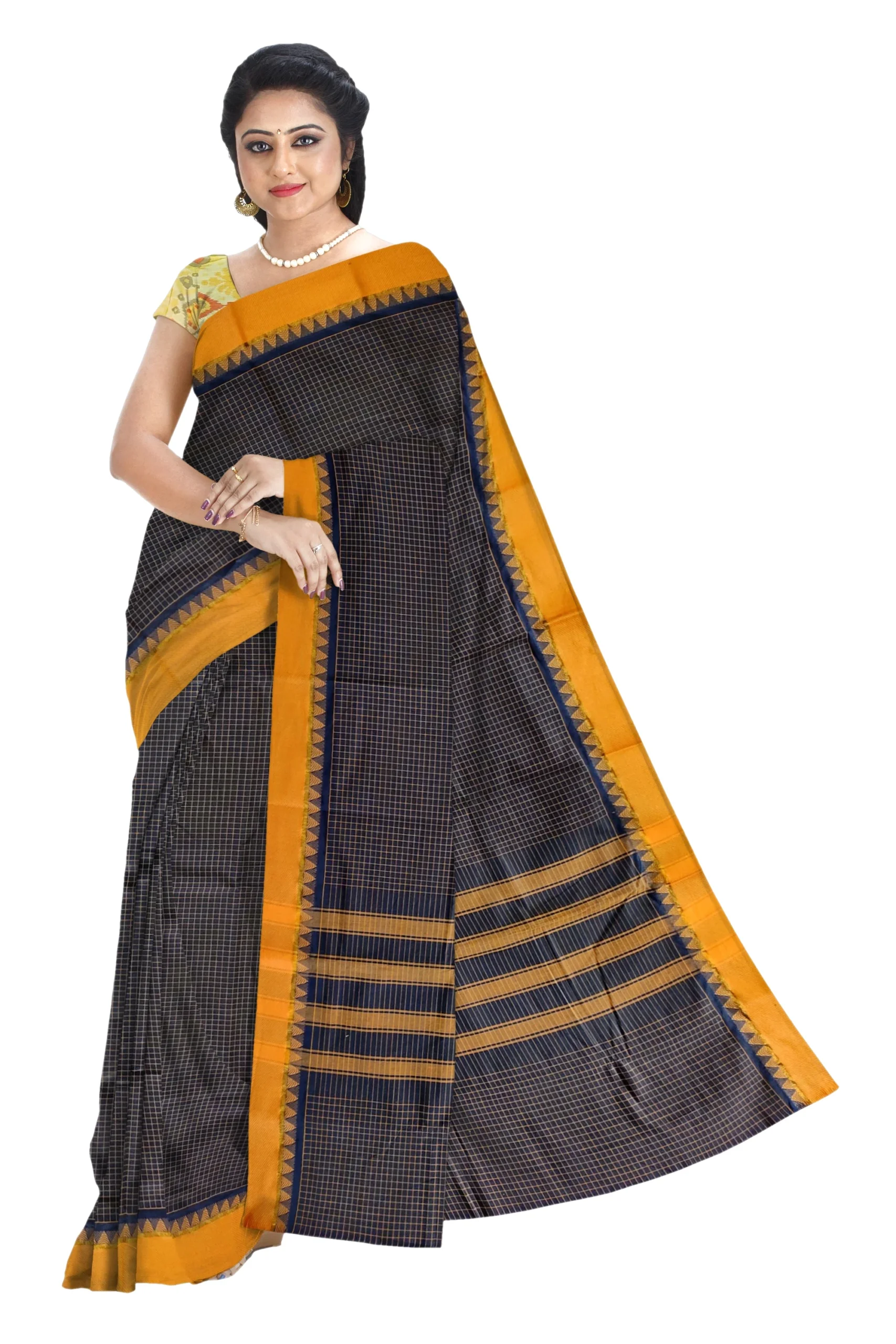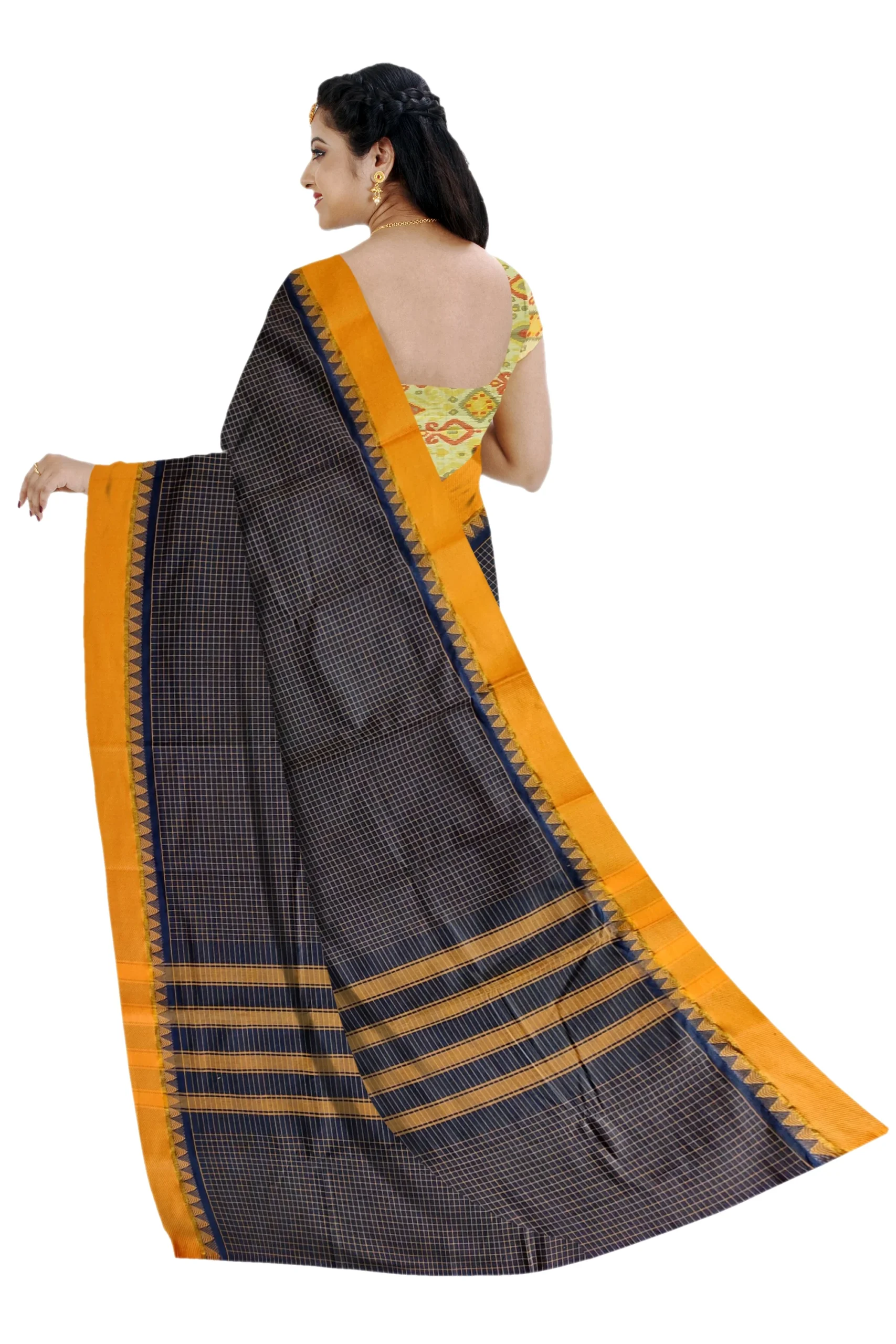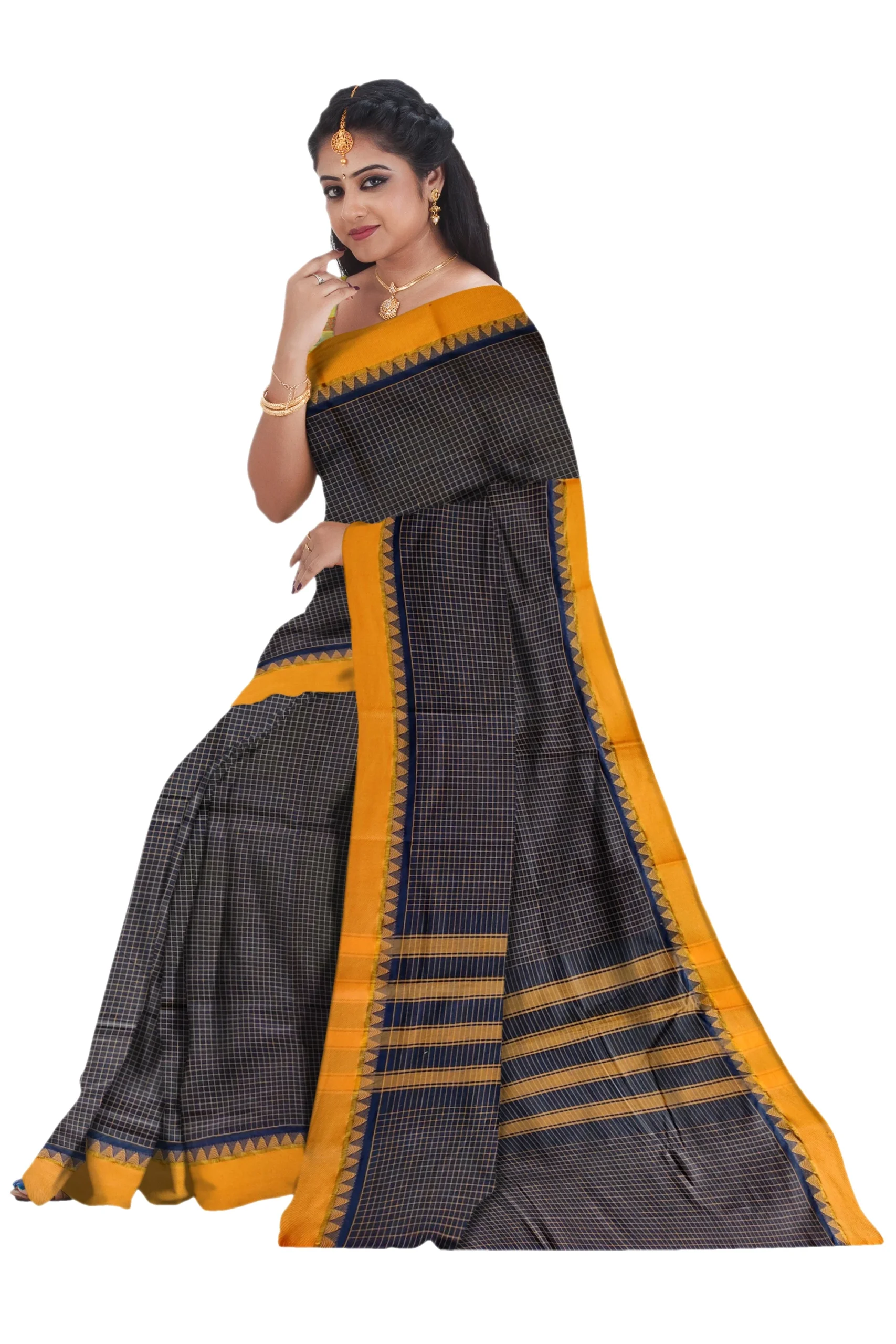 This saree features a stylish navy blue colour with a traditional checked pattern across the body, giving it a sophisticated and graceful appearance. Checked designs are a signature feature of Chettinad cotton sarees and are loved for their timeless appeal. The small check pattern adds a refined texture to the saree while maintaining its elegant and traditional style.