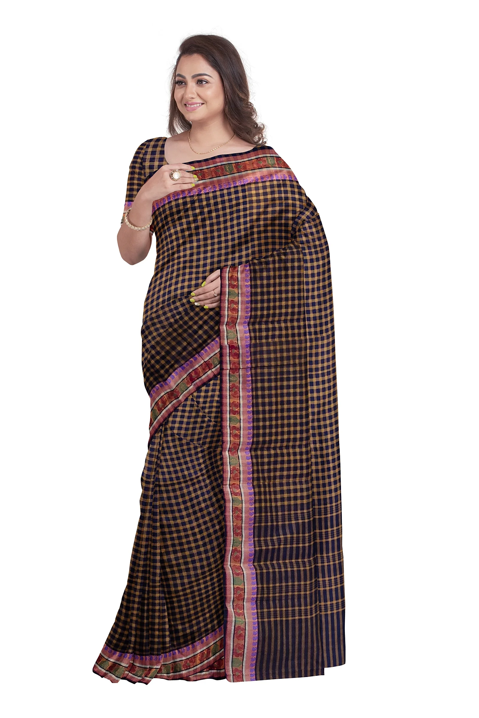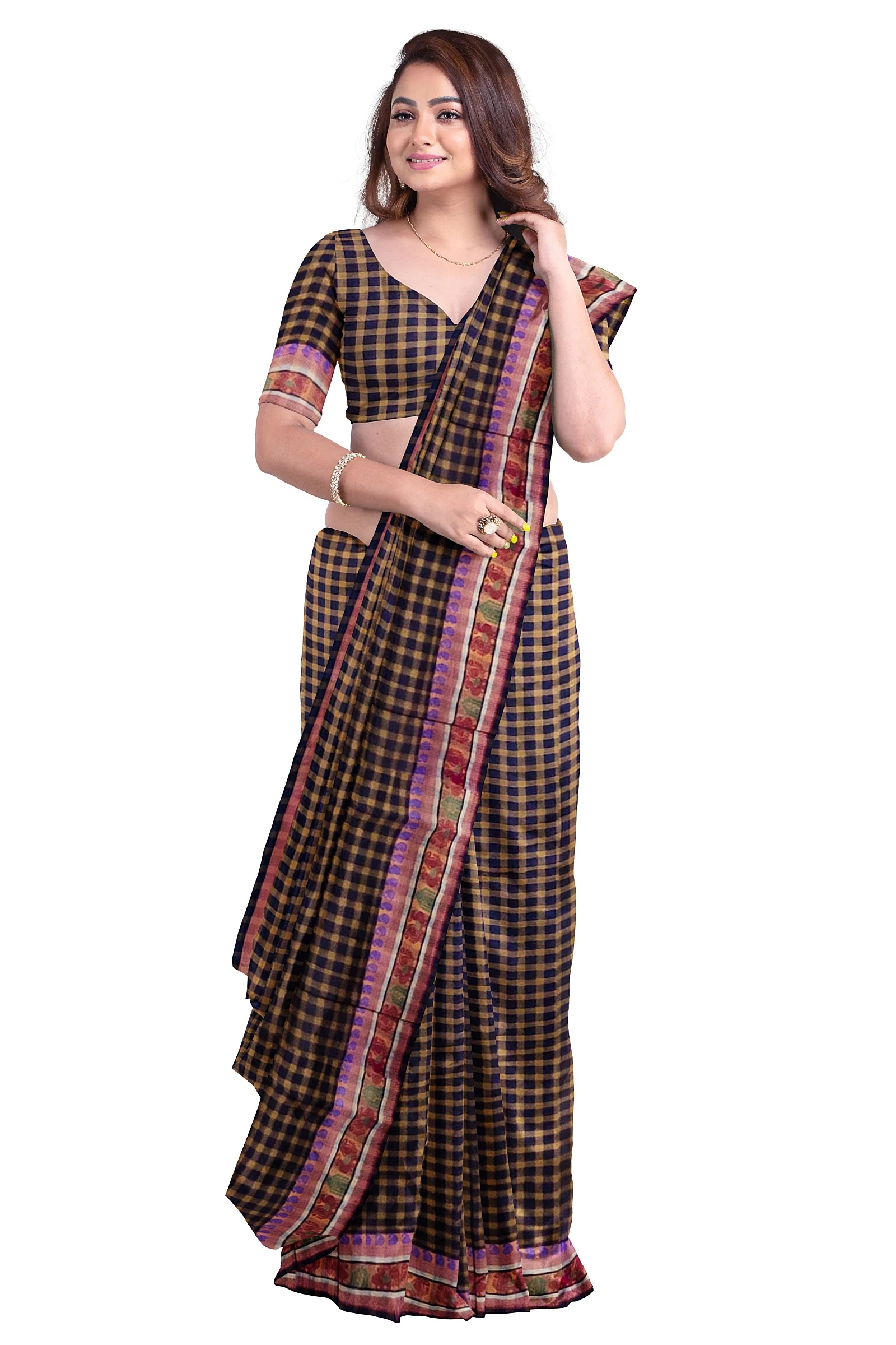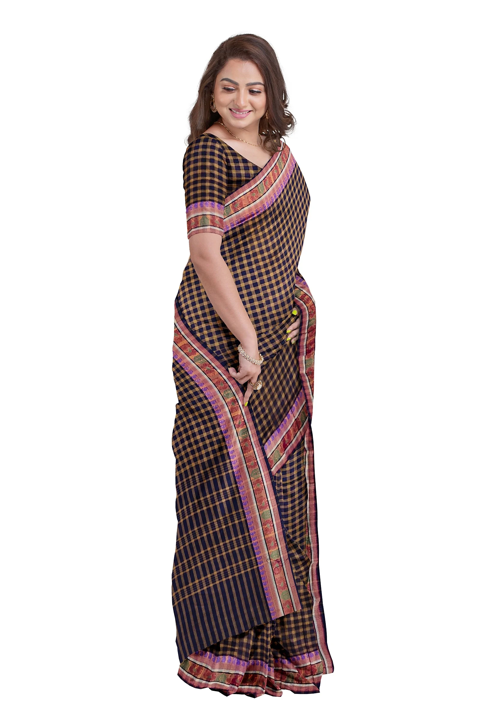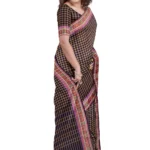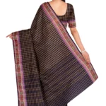 This beautiful Chettinad cotton checked saree features a navy blue and brown check line design, paired with a thread-woven border that adds a touch of traditional elegance. The saree length is 5.5 meters, perfect for classic draping styles. Without a blouse piece, this saree offers the freedom to pair it with your favorite blouse or jacket. The combination of navy blue and brown creates a sophisticated and earthy look.