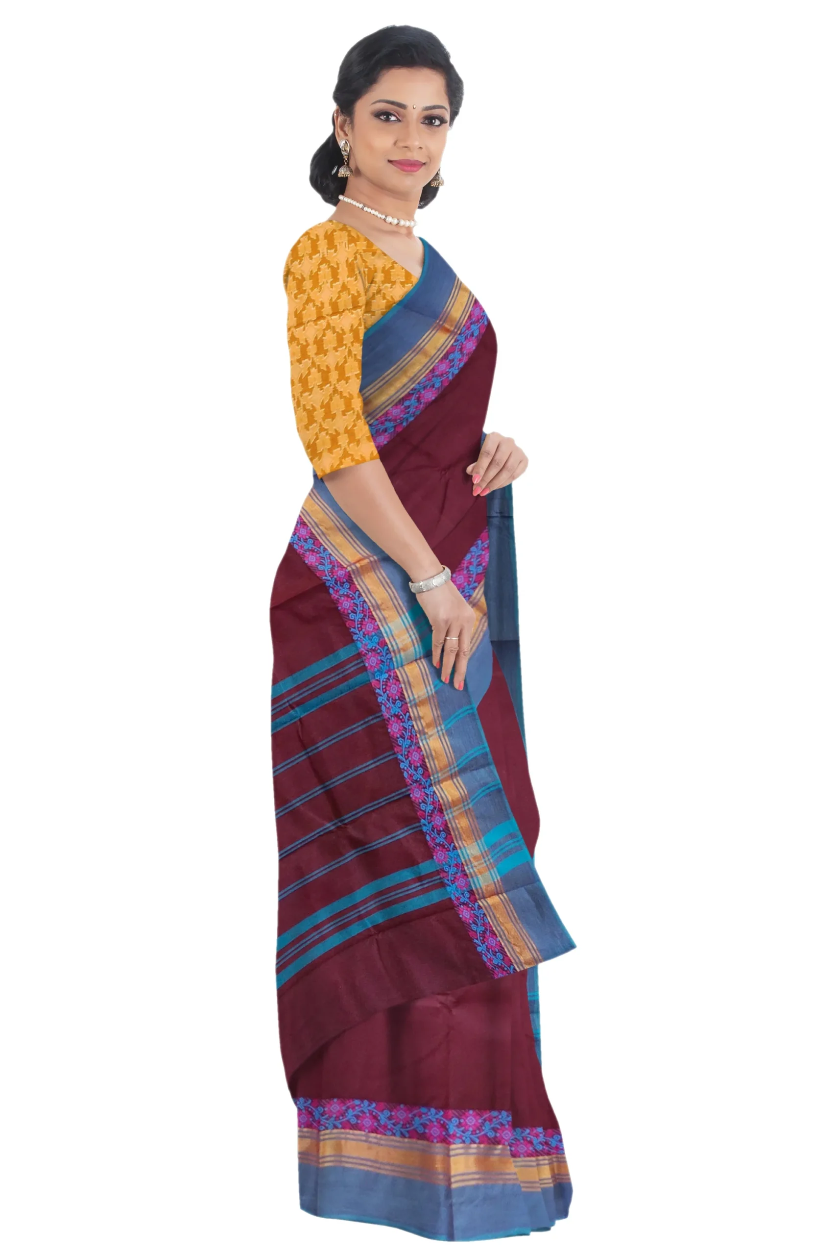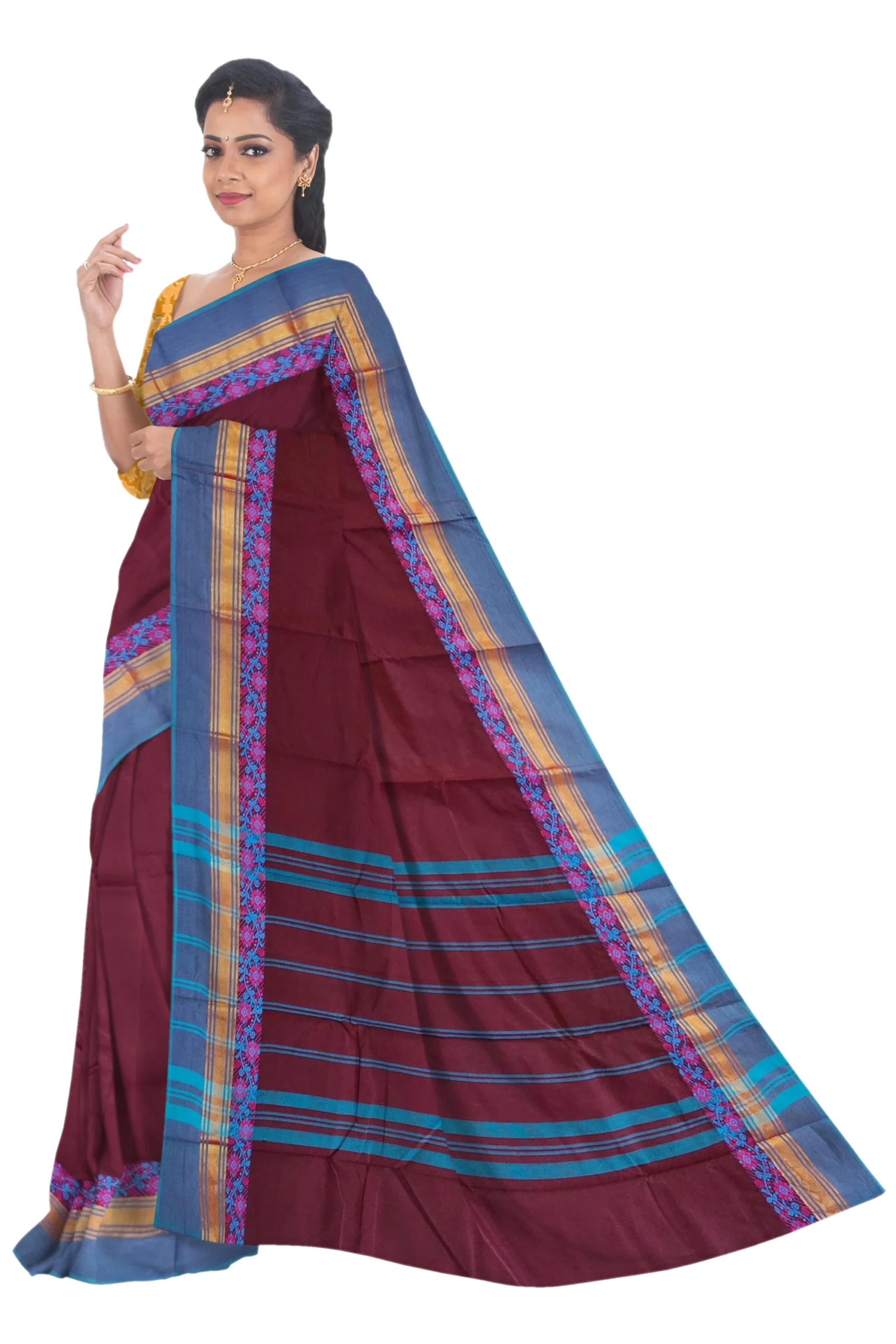 The saree features a deep brown base, symbolizing elegance and sophistication. This timeless color makes it suitable for multiple occasions such as office wear, casual outings, temple visits, and family functions. The minimal plain body enhances its versatility, allowing you to style it in both traditional and contemporary ways.