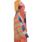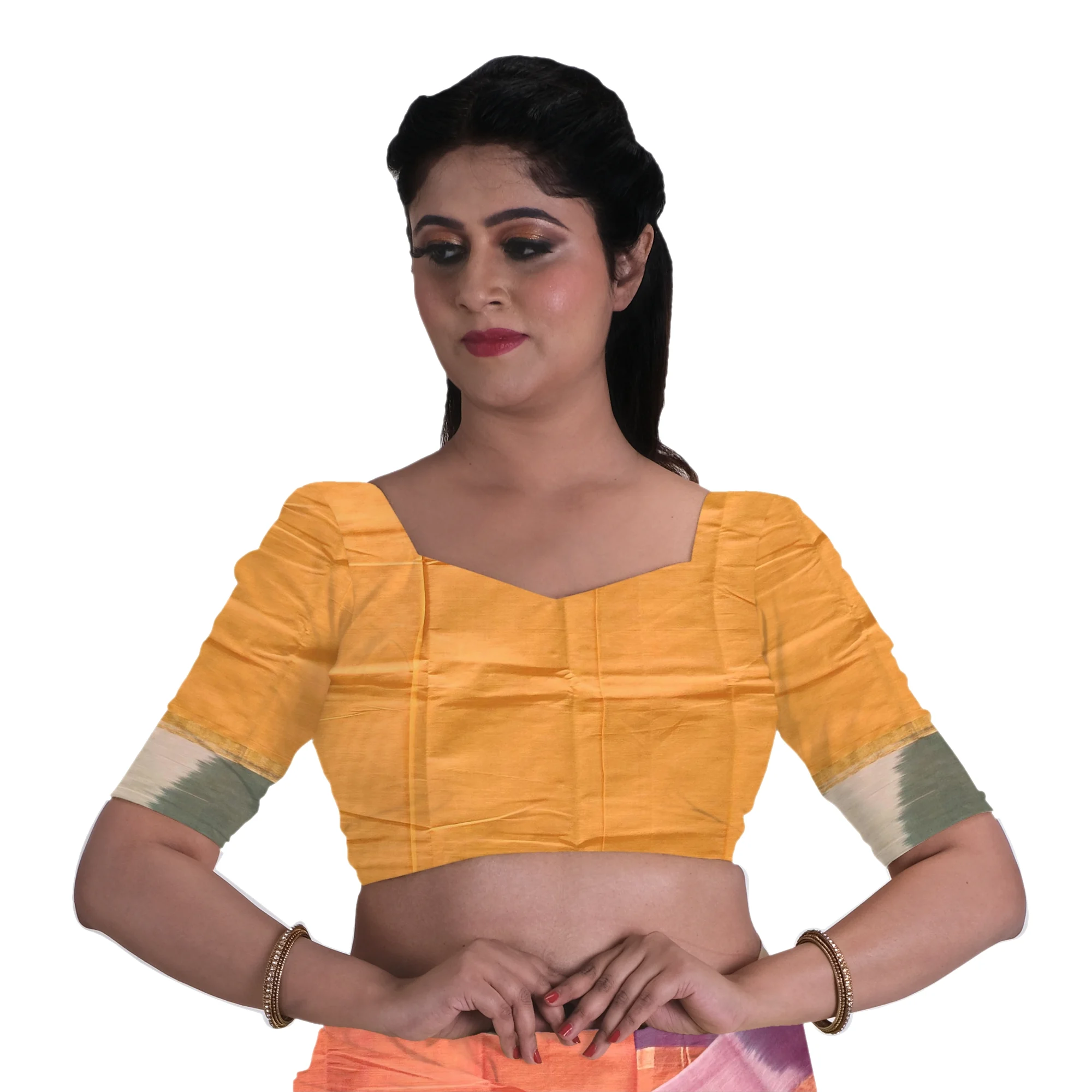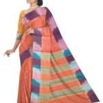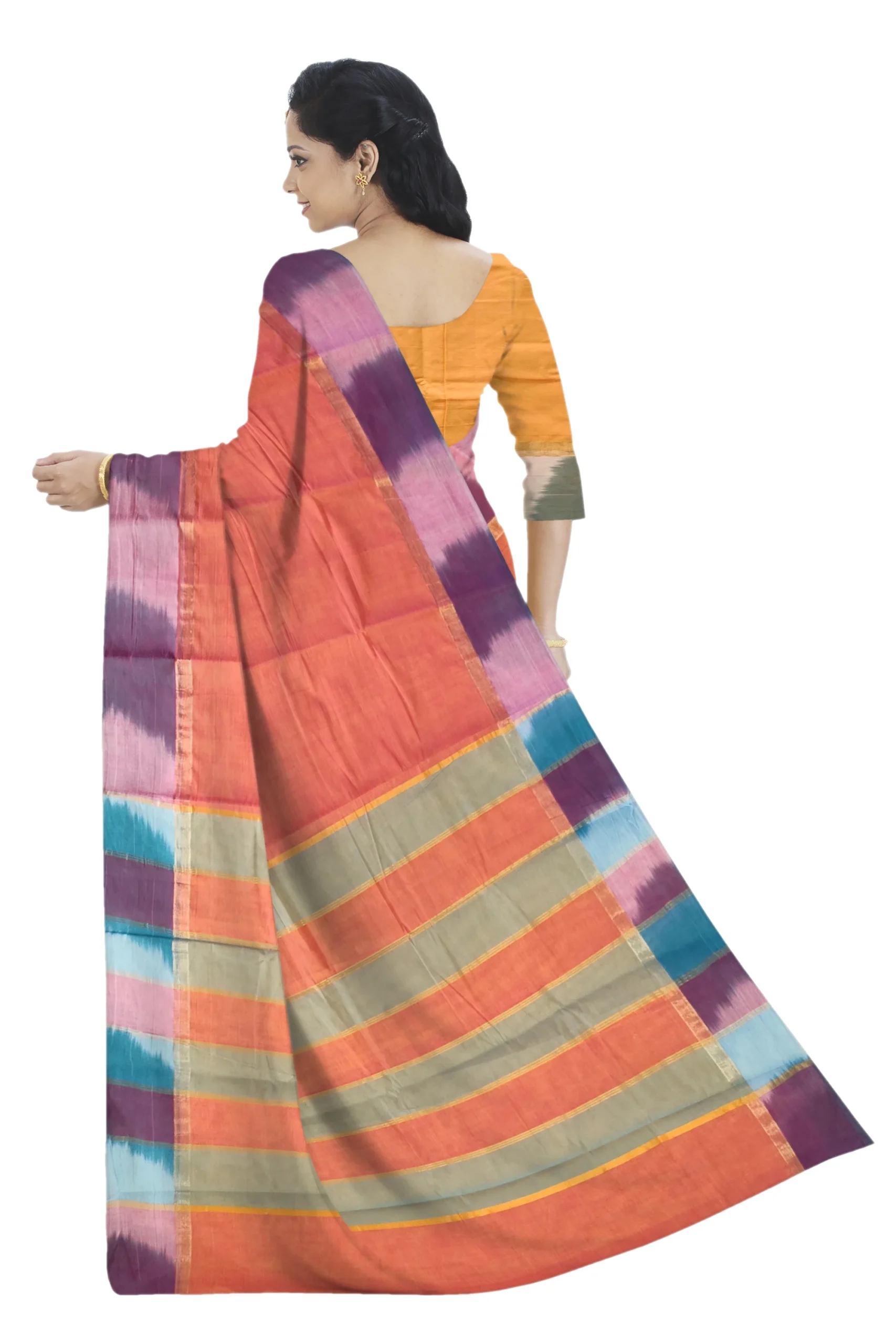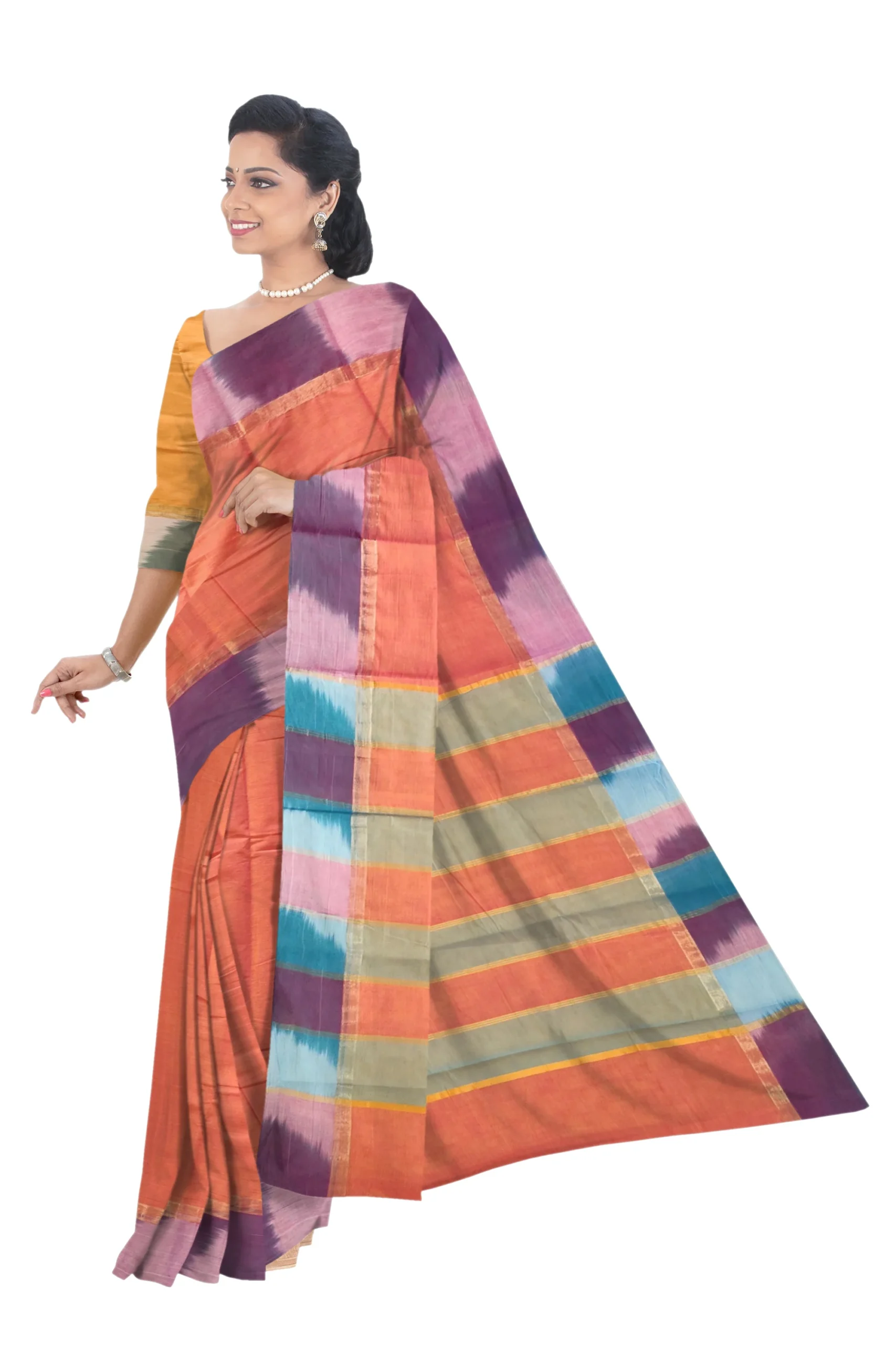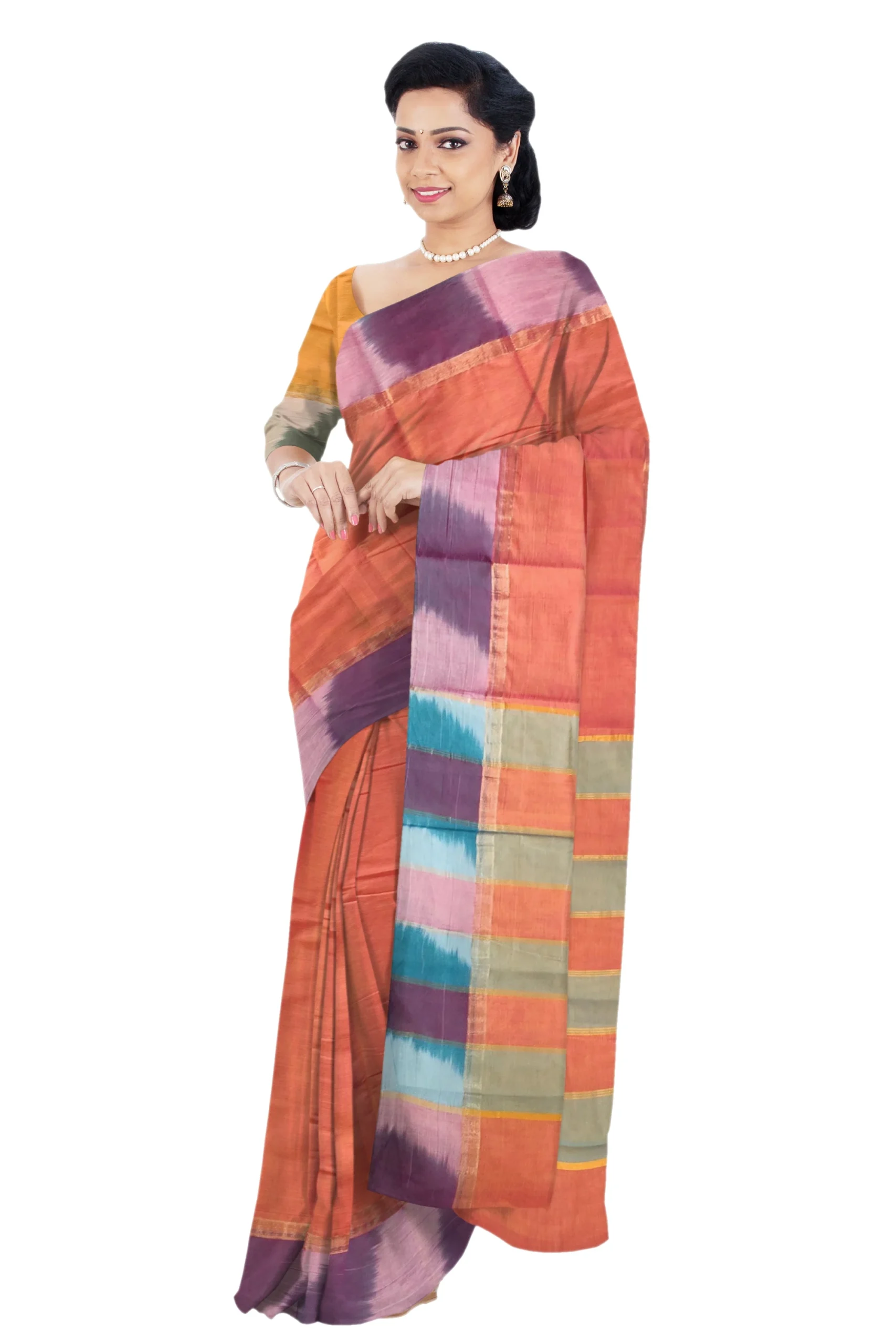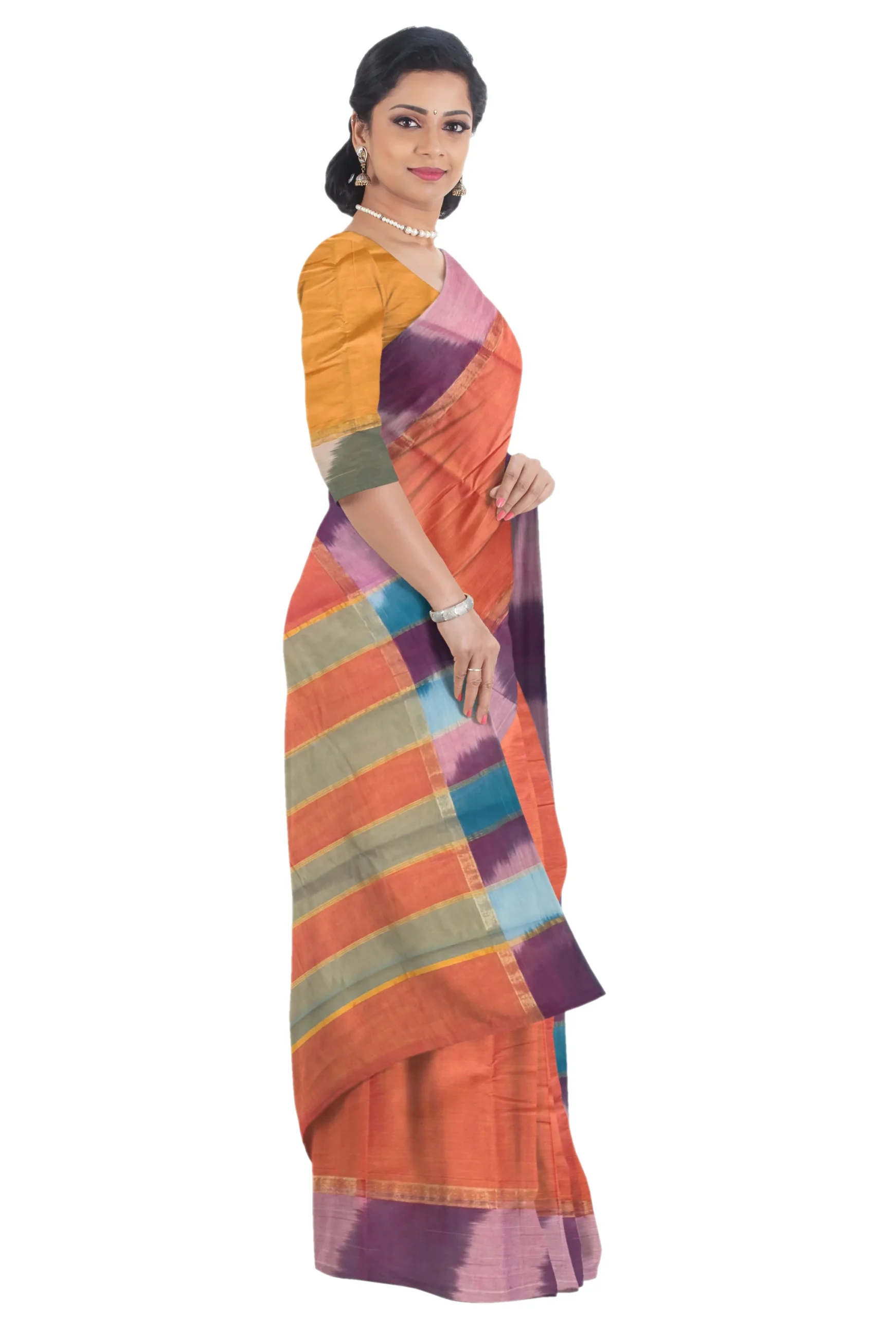 A Chettinad cotton plain saree in orange color comes with a blouse featuring a Pochampally border. The saree length is 5.5 meters, and the blouse length is 0.80 meters. Chettinad cotton is known for its comfort and breathability, making this saree suitable for various occasions. The plain orange body of the saree provides a vibrant backdrop that lets the traditional Pochampally border stand out beautifully. The included blouse adds convenience, allowing you to wear the saree straight away.