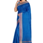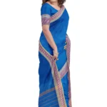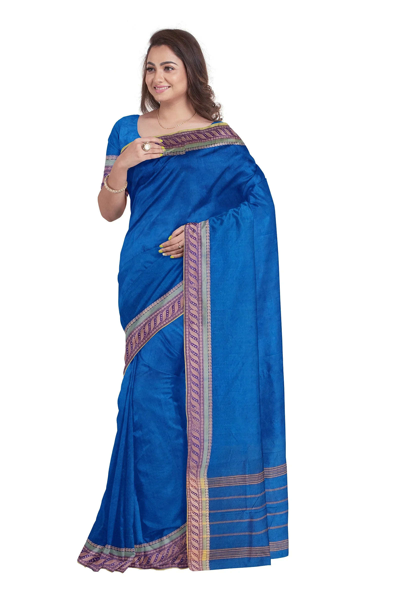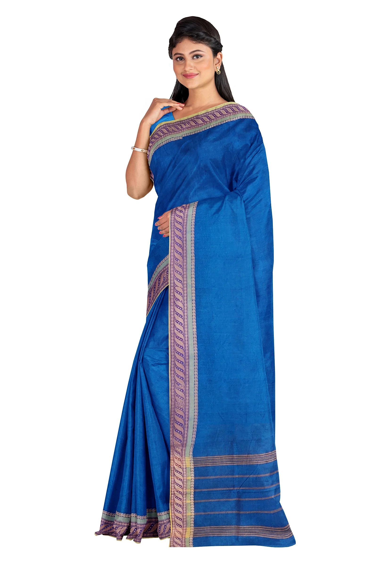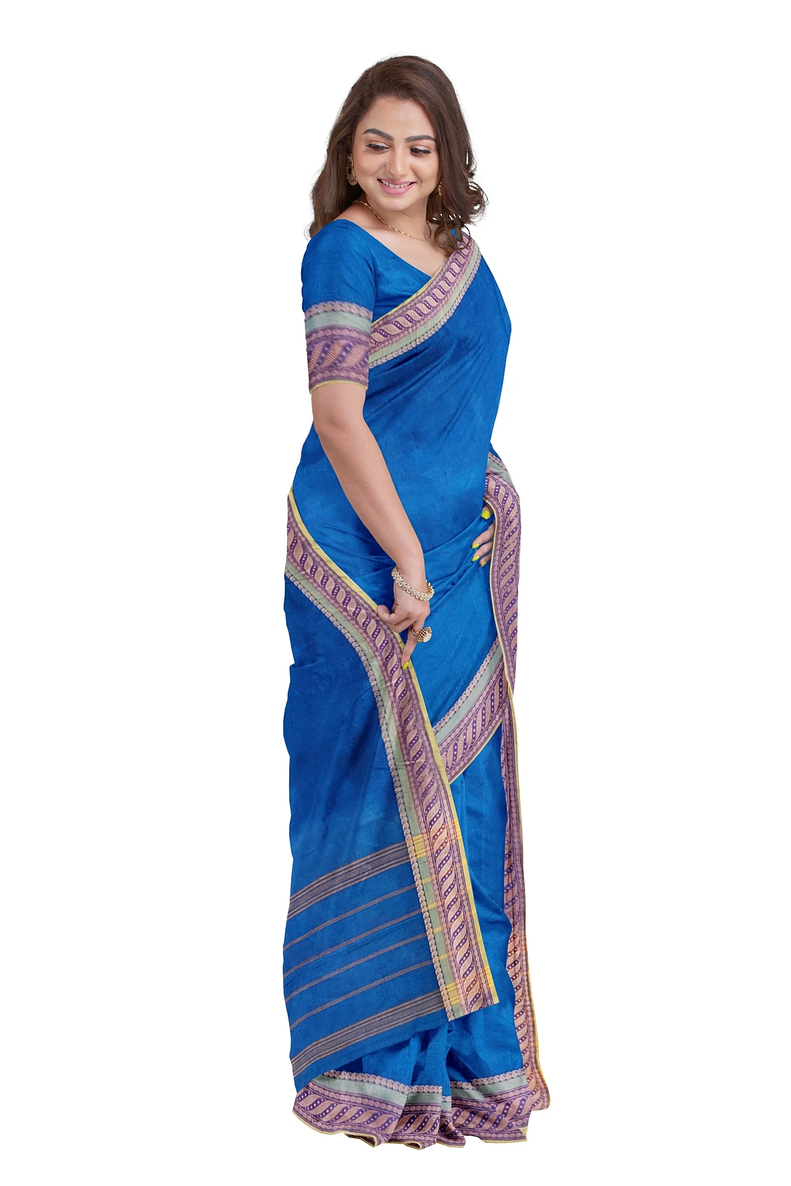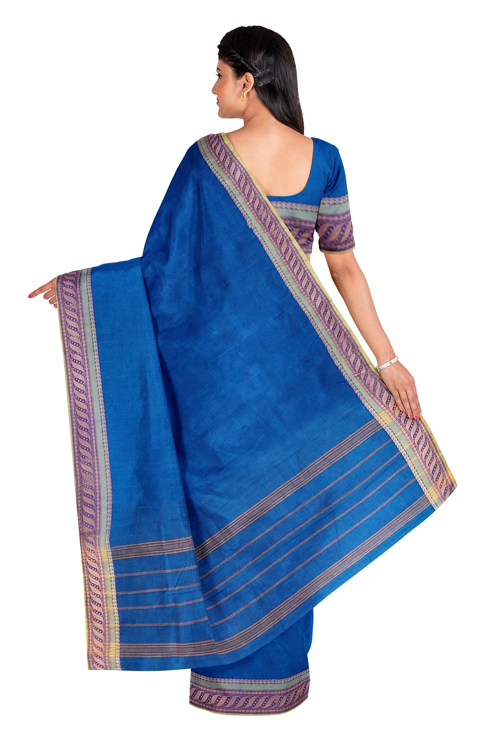 A Chettinad cotton plain saree in blue color without a blouse features an attractive thread-woven border. The saree length is 5.5 meters. Chettinad cotton is known for its comfort and breathability, making this saree suitable for various occasions. The plain blue body of the saree provides a simple and elegant backdrop that lets the attractive thread-woven border stand out beautifully. Without a blouse piece, you have the flexibility to choose a matching or contrasting blouse to complement the blue saree
