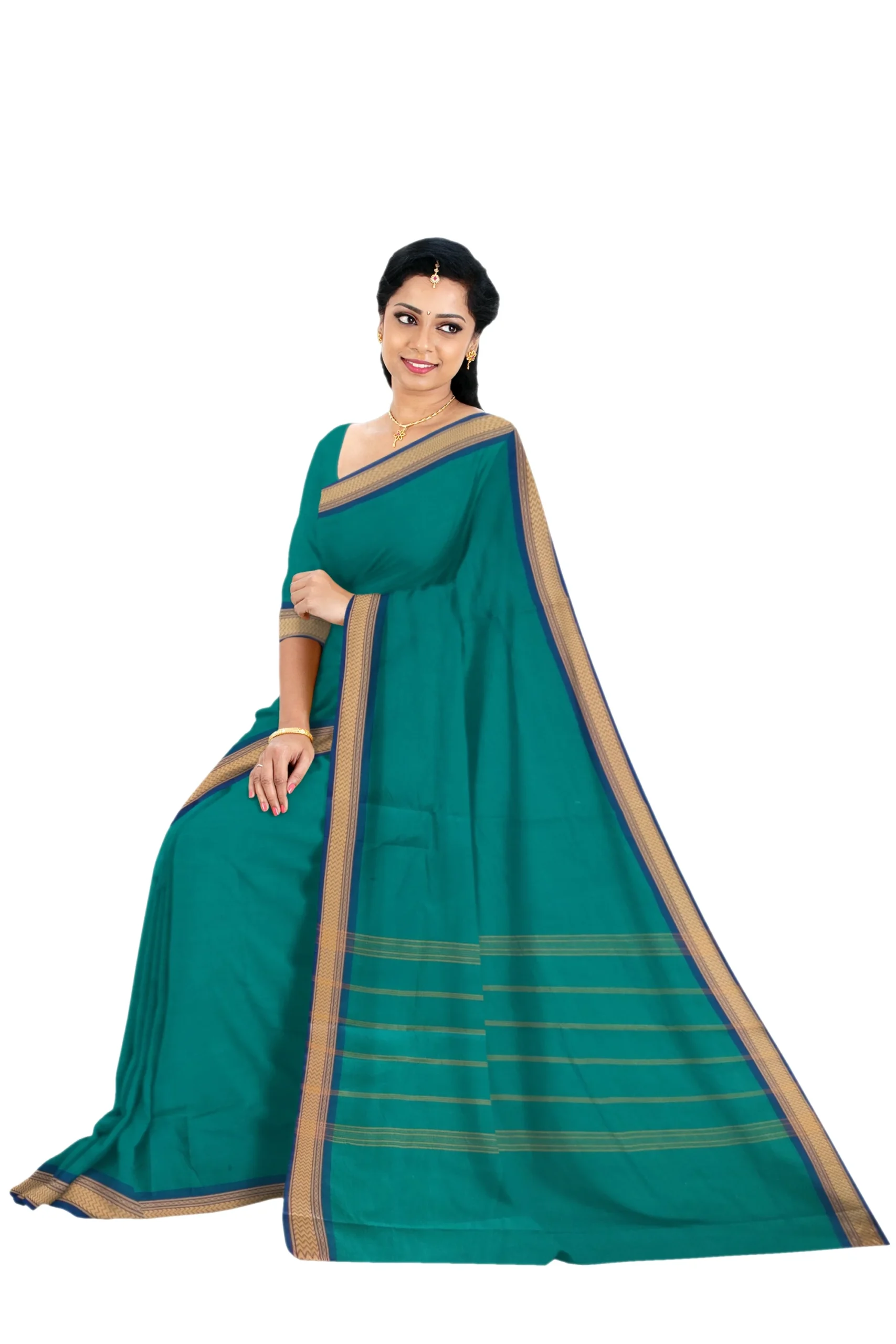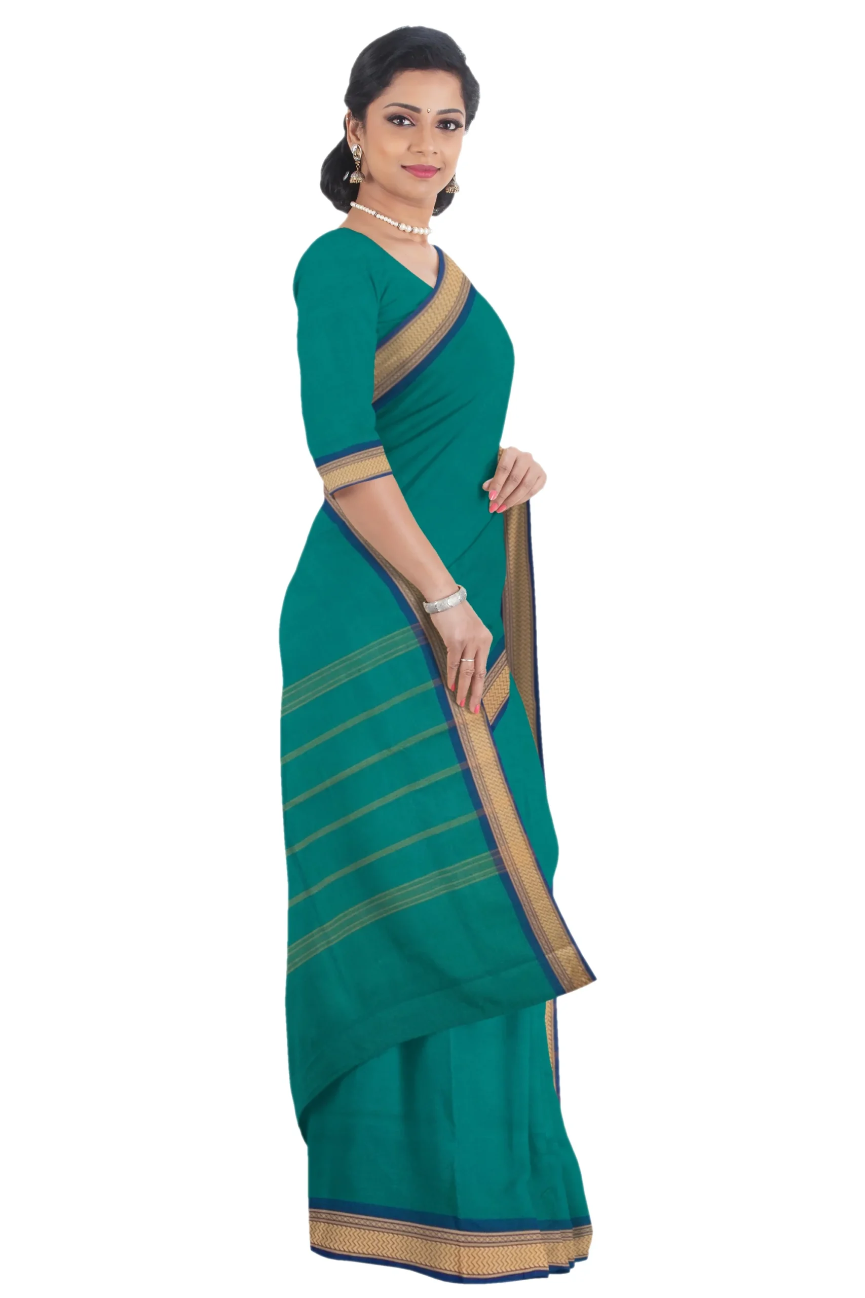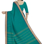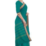 A Chettinad cotton plain saree in green color without a blouse features an attractive thread-woven small border. The saree length is 5.5 meters. Chettinad cotton is known for its comfort and breathability, making this saree suitable for various occasions. The plain green body of the saree provides a simple and elegant backdrop that lets the attractive thread-woven border stand out beautifully. Without a blouse piece, you have the flexibility to choose a matching or contrasting blouse to complement the green saree.