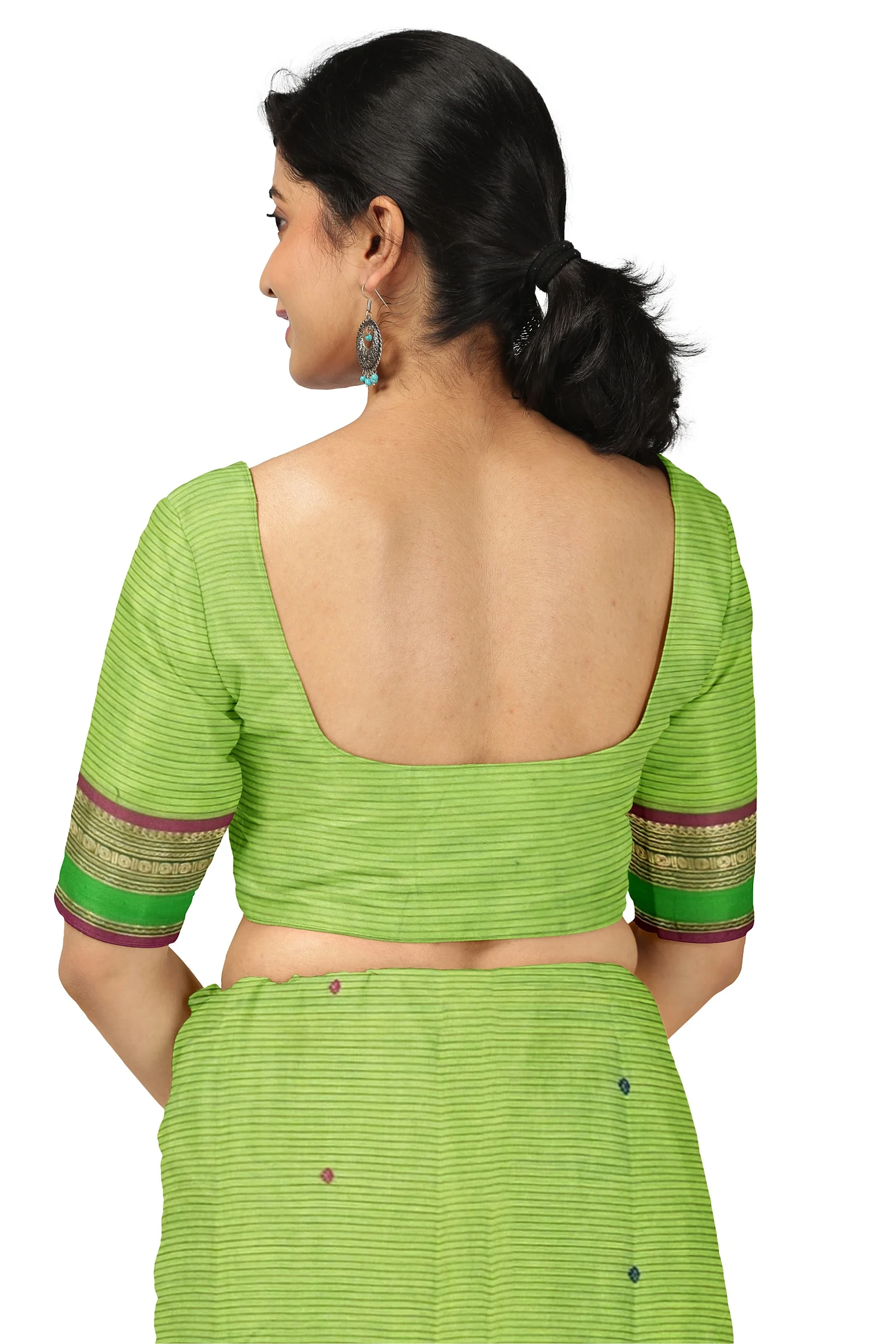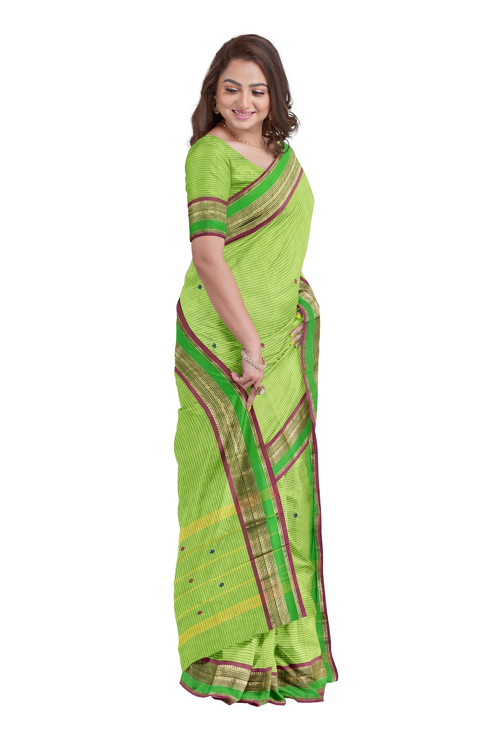 If you are searching online for Chettinad cotton putta sarees with traditional borders, this elegant green saree is an excellent choice. Its combination of breathable cotton fabric, subtle horizontal line design, and artistic border makes it a timeless saree for every wardrobe.