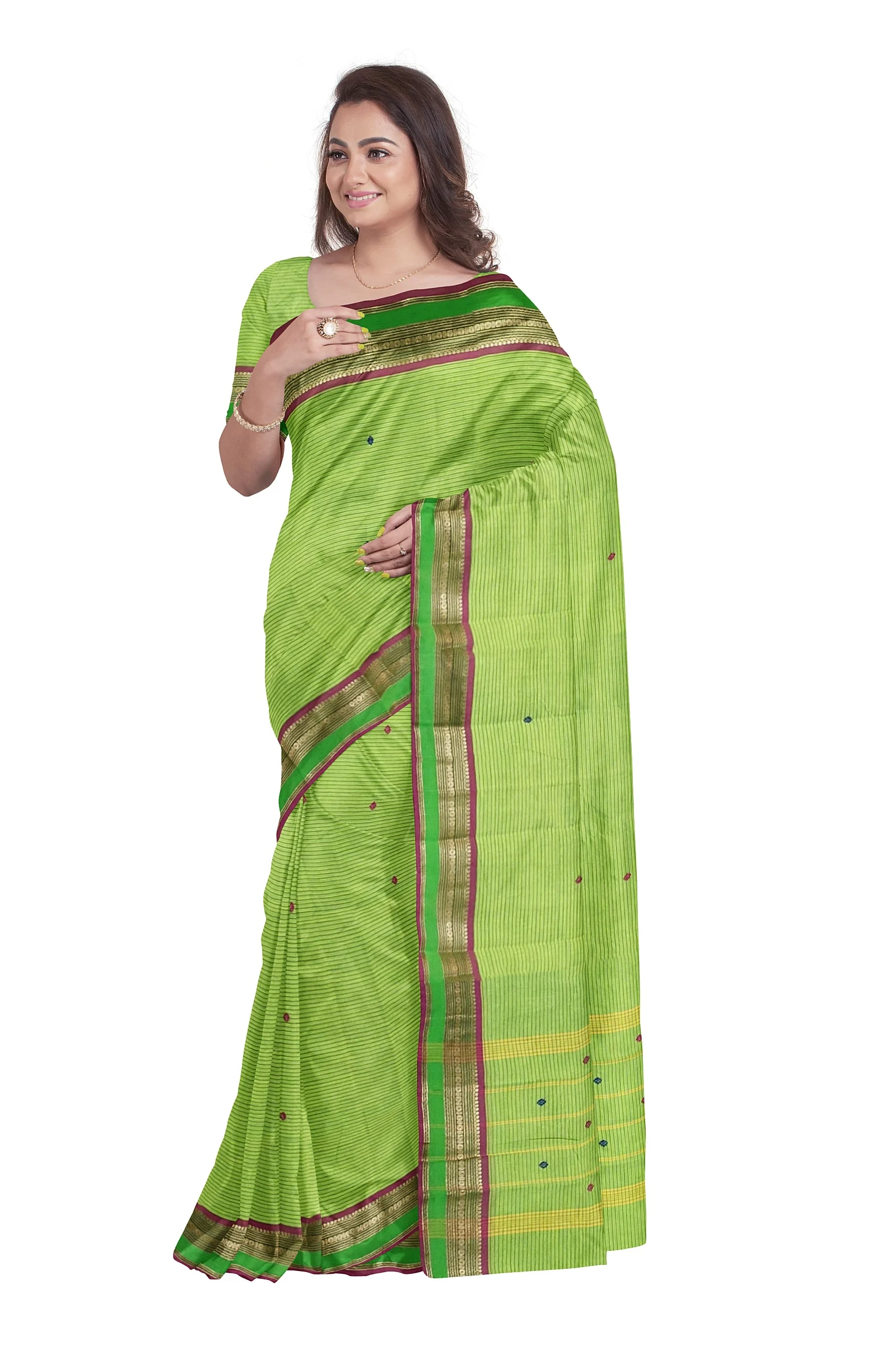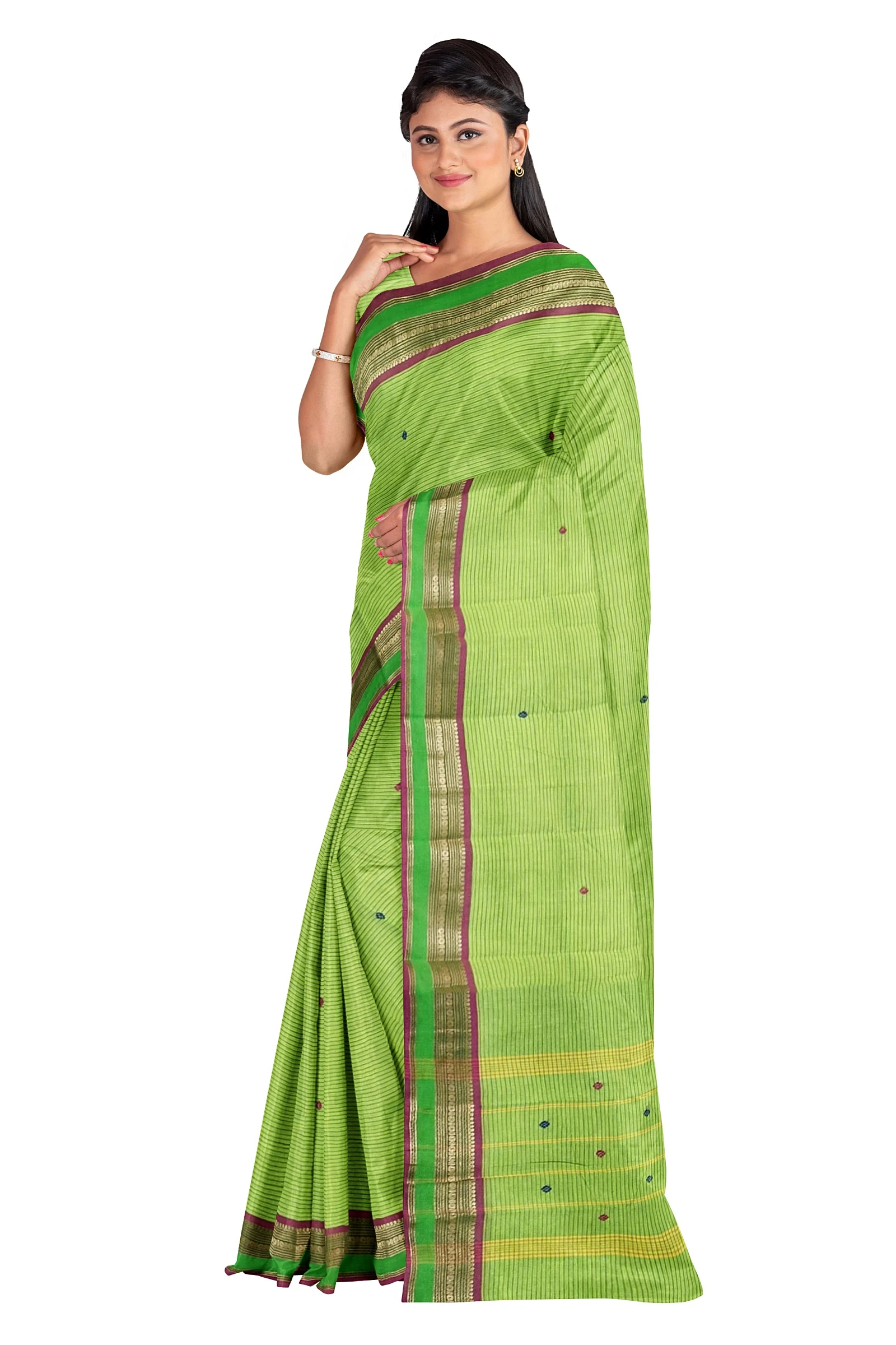 This saree comes in a refreshing green colour, giving it a vibrant and graceful appearance. The body of the saree features a horizontal line design along with delicate putta motifs, creating a unique texture and visual appeal. The horizontal line pattern adds a modern touch while maintaining the traditional charm of Chettinad cotton weaving.