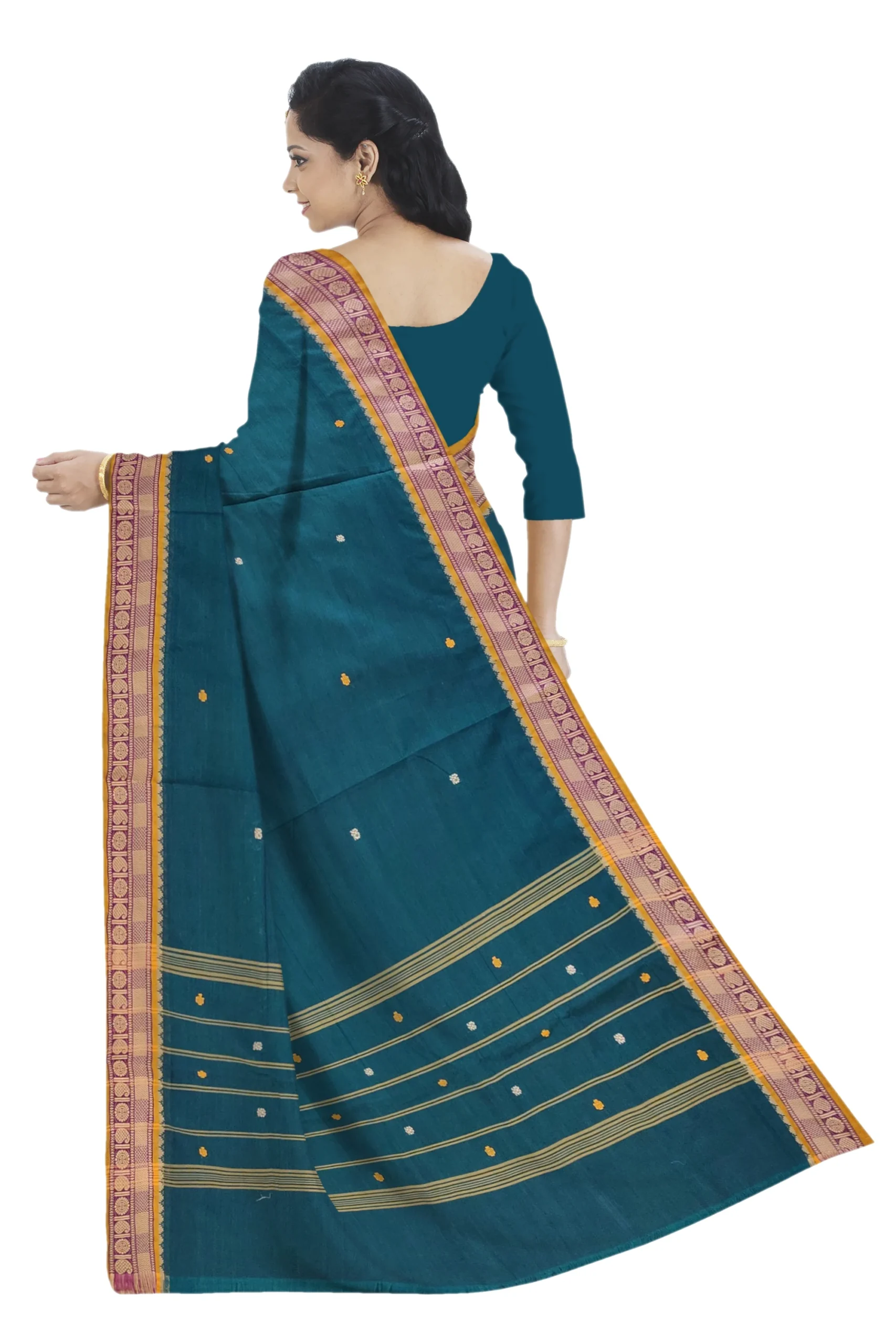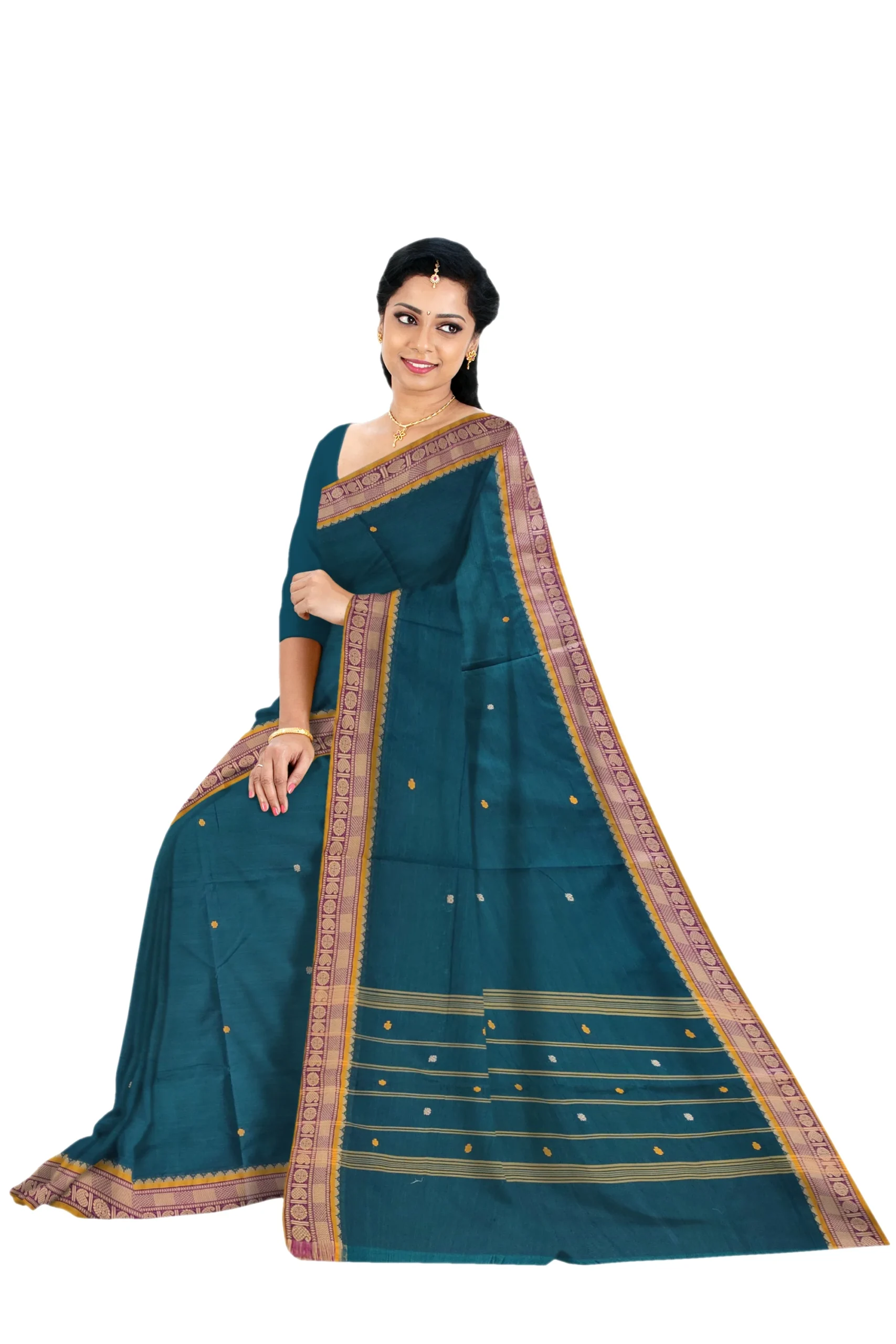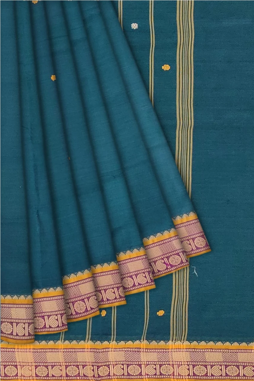 If you are searching online for Chettinad cotton putta sarees with traditional borders, this peacock green saree is a perfect choice. Its elegant colour, delicate putta motifs, and intricate mango and rudraksha border make it a beautiful saree for any traditional wardrobe.