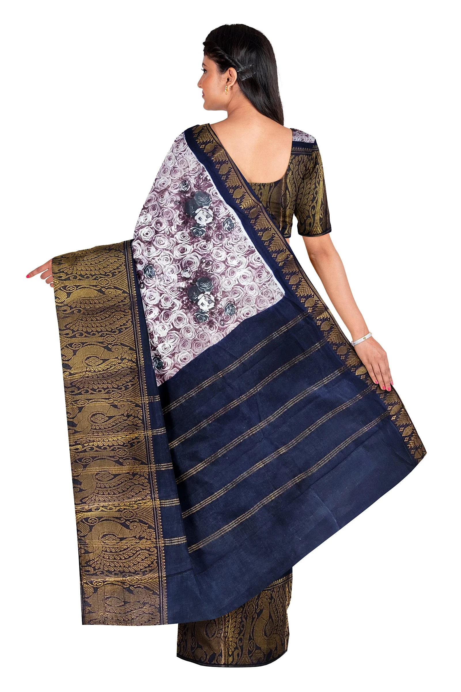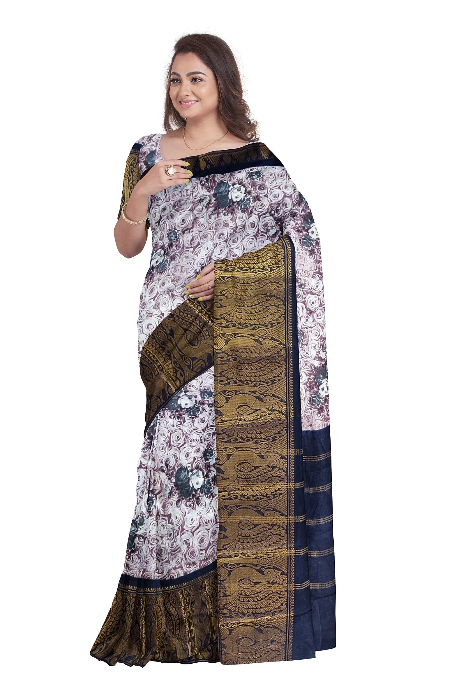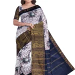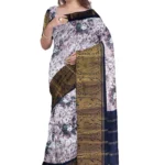 A cotton printed saree without a blouse features a brown and white colour base with rose flower designs printed all over the saree. It has a big zari border with a peacock design. The saree length is 5.5 meters. The cotton fabric makes the saree comfortable and breathable for wear on various occasions. The all-over rose flower print in brown and white gives the saree a charming and floral look. The big zari border with a peacock design adds a touch of tradition and elegance. Without a blouse, you can choose a matching or contrasting blouse to complement the saree.