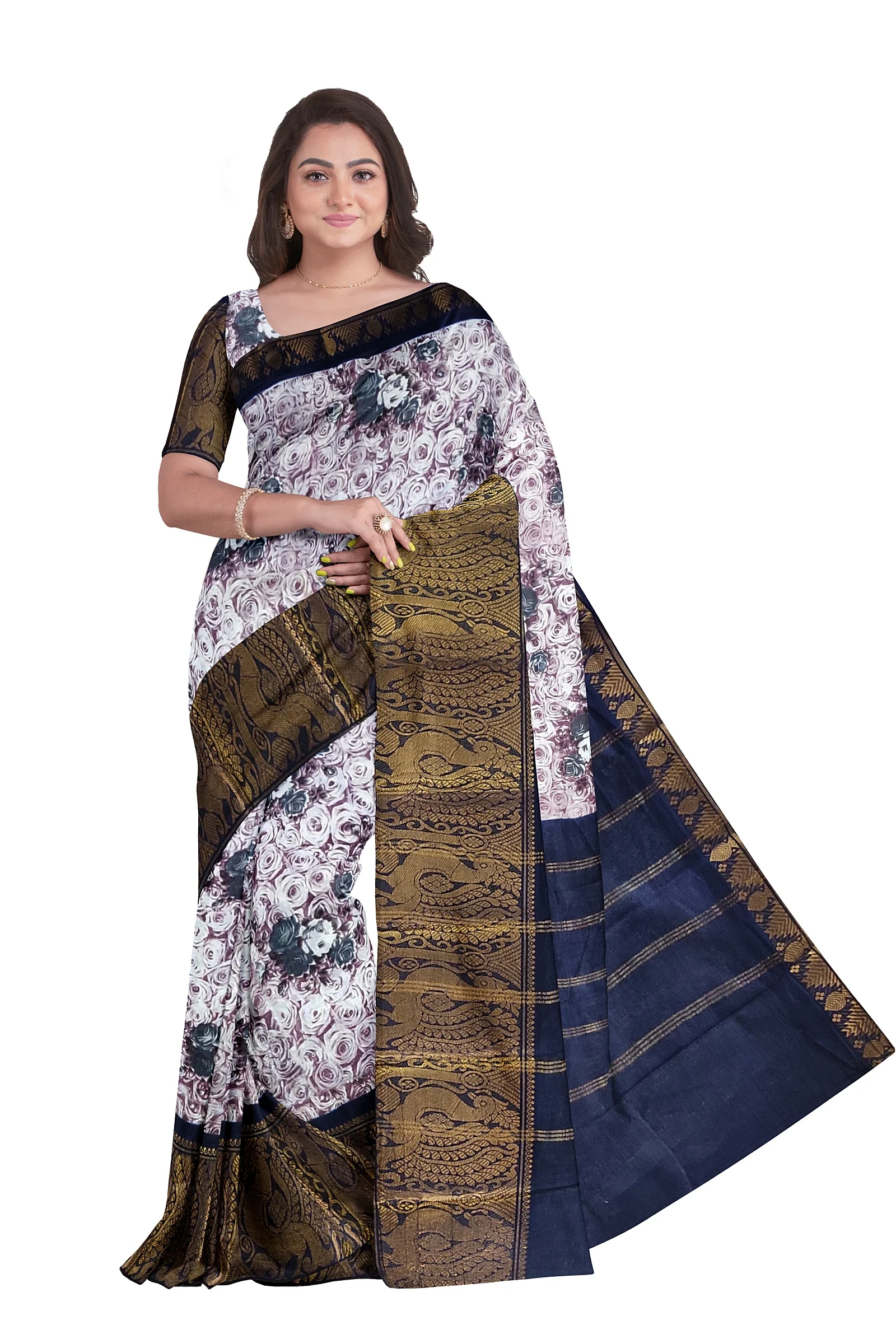 2. Rose Flower Print: Brown and white colour rose flowers are printed all over the saree.