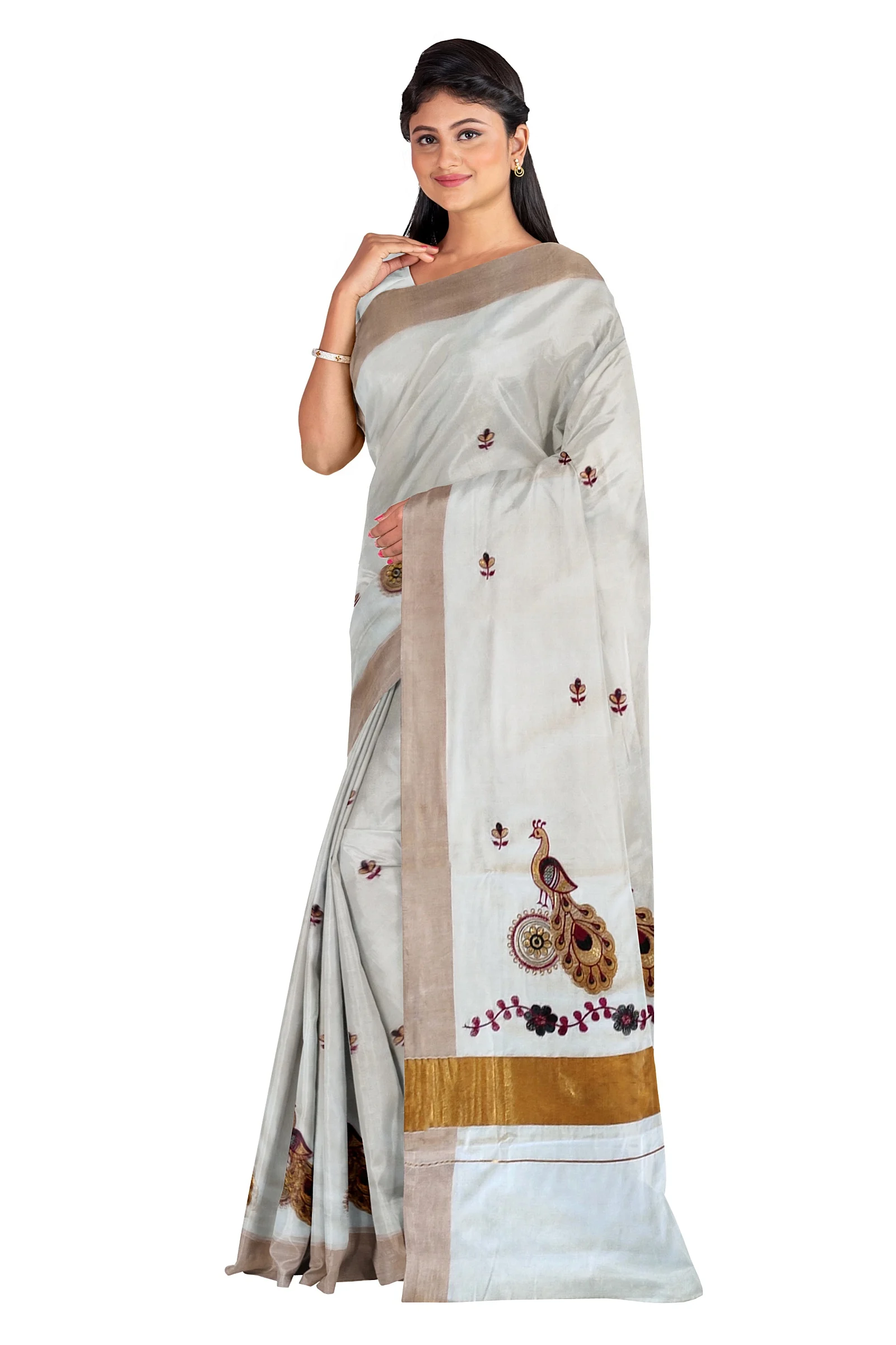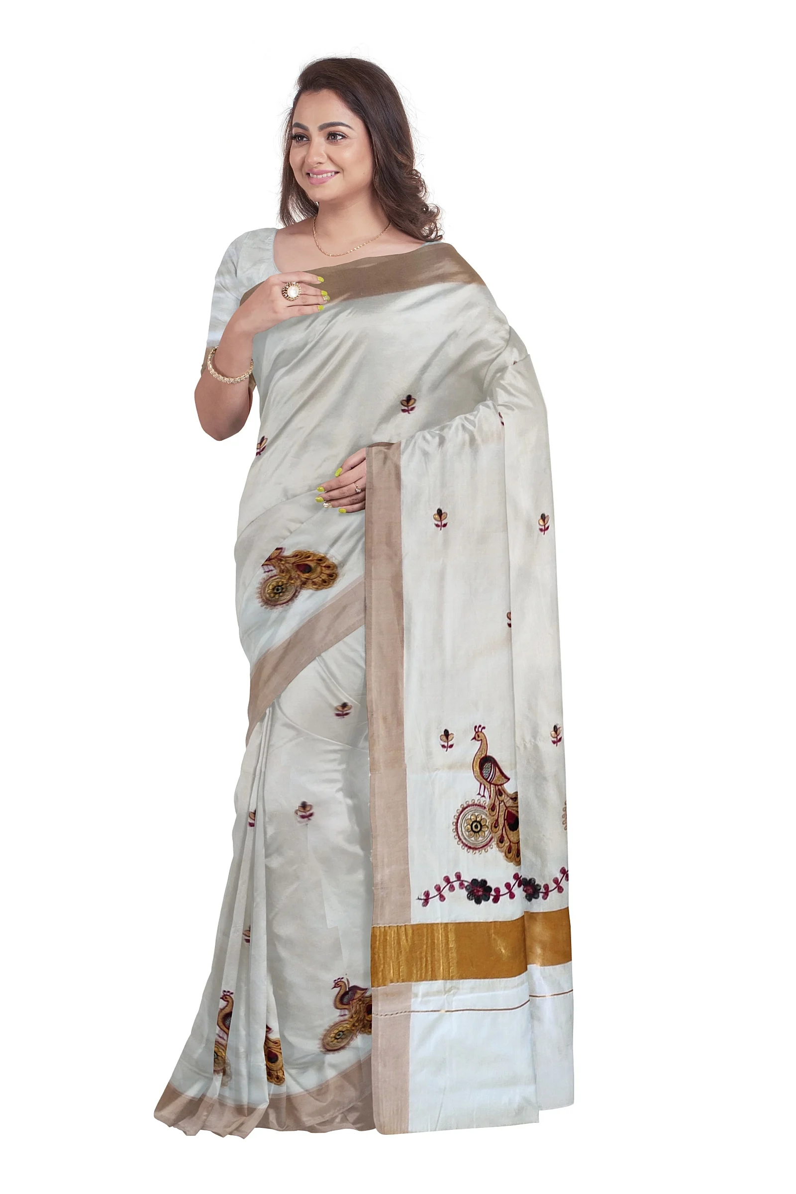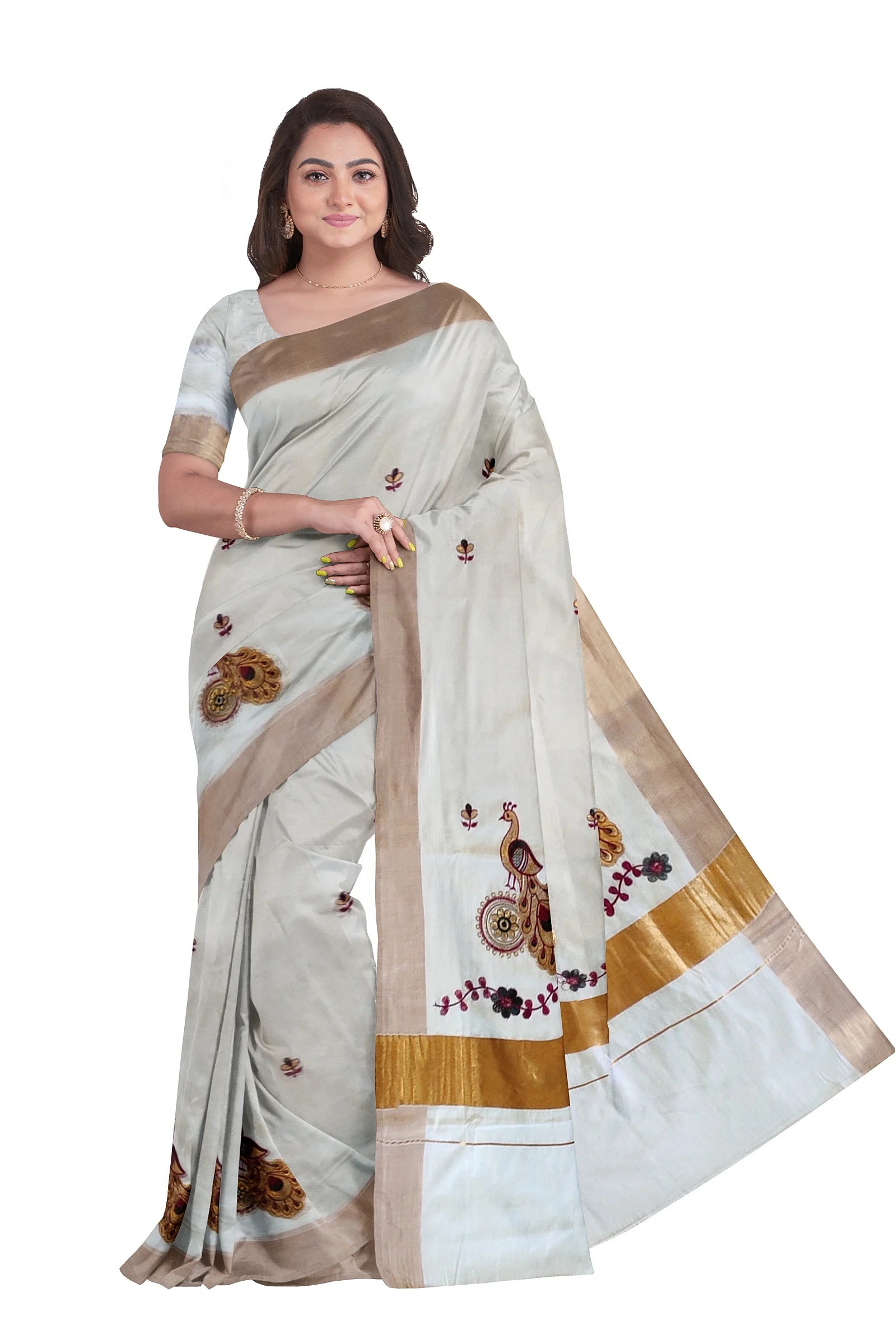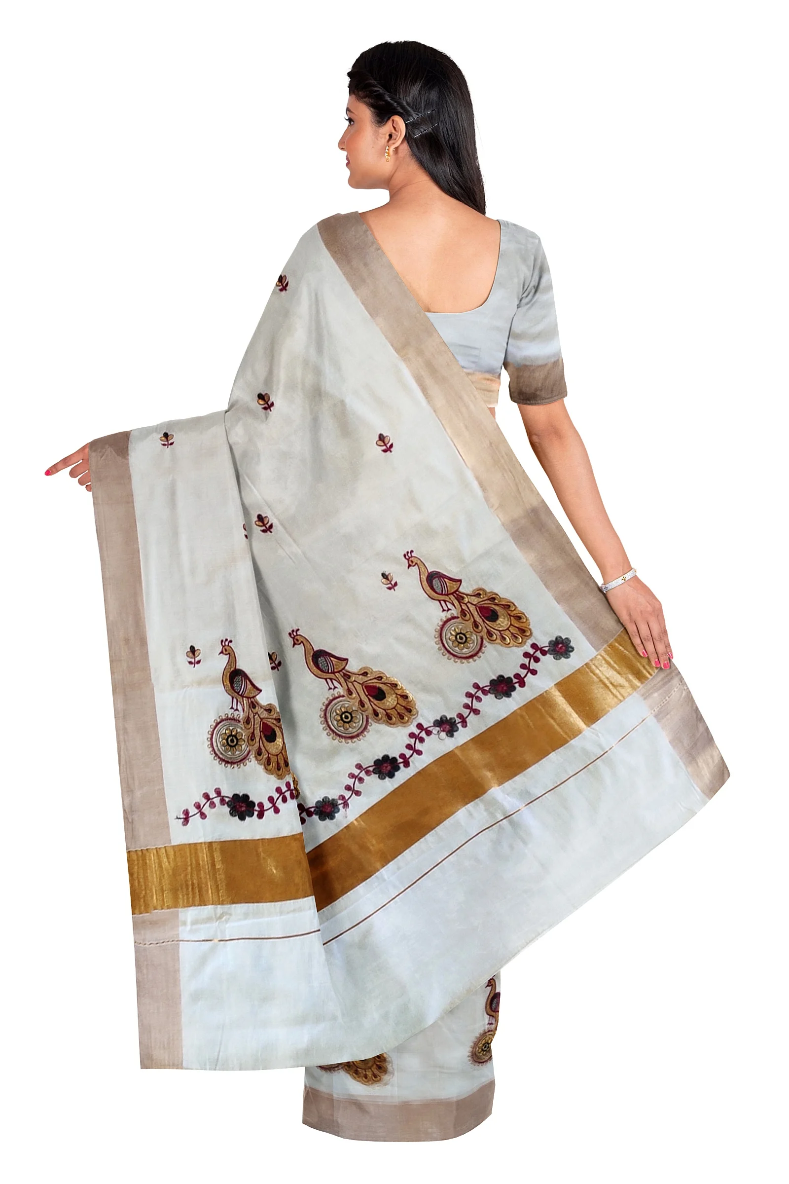 If you are searching online for a Kerala cotton Kasavu embroidery saree with peacock and creeper design, this saree is a perfect choice. Its elegant colour, intricate embroidery, and breathable fabric make it a must-have for your saree collection.