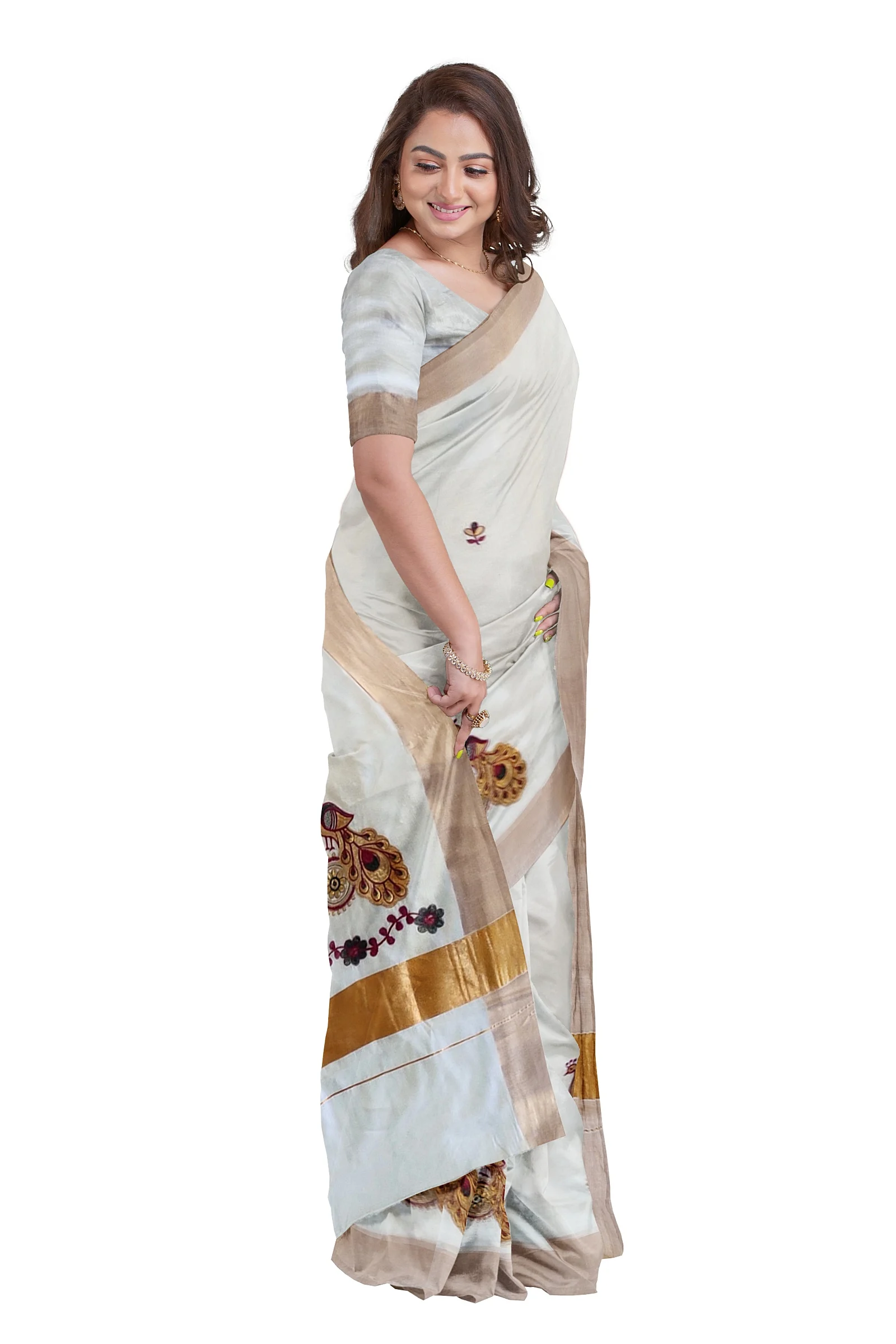 This saree comes in a graceful off-white (cream) base colour, which is the signature of traditional Kerala Kasavu sarees. The soothing neutral tone represents purity and sophistication, making it ideal for both festive and everyday wear. The soft base enhances the richness of the embroidery and gives the saree a refined, elegant look.