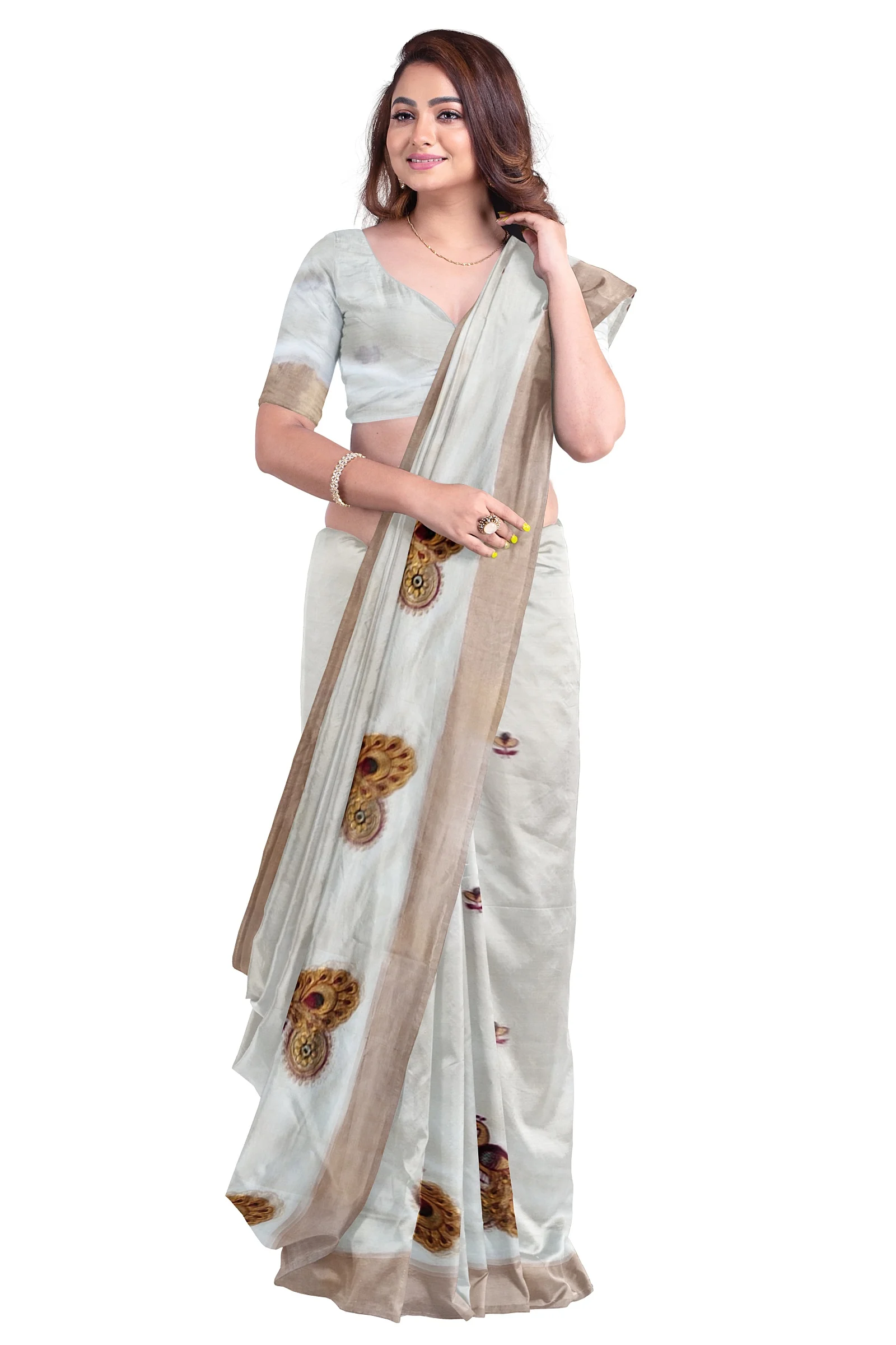 The highlight of this saree is its stunning gold-coloured peacock embroidery on the border, symbolizing grace, beauty, and tradition. The peacock motifs are intricately designed, showcasing fine craftsmanship and attention to detail. These motifs add a rich and cultural touch, making the saree stand out with elegance.