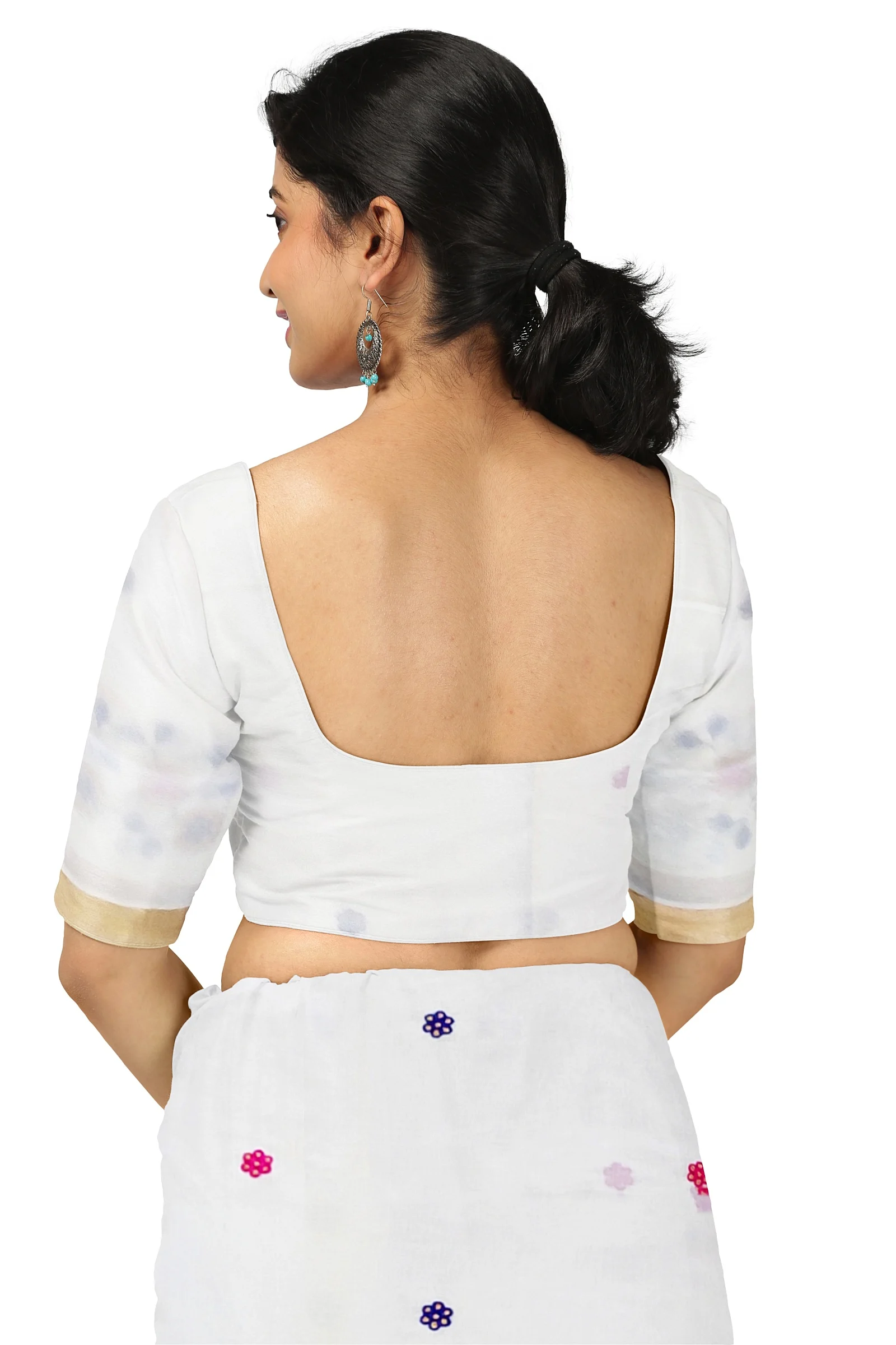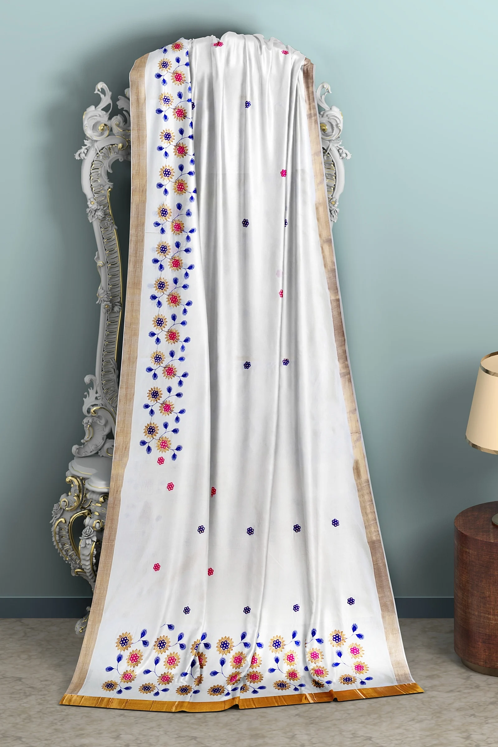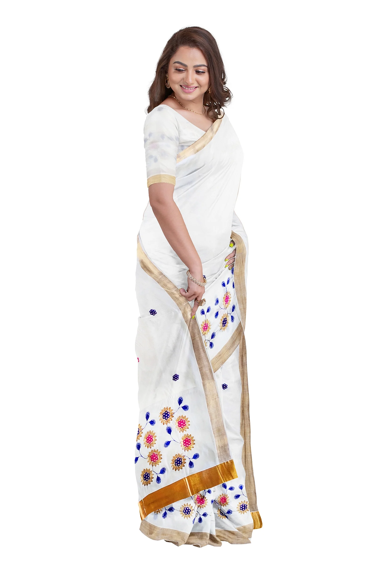 Kerala Kasavu sarees are well known for their simplicity, elegance, and cultural significance. This saree maintains the traditional charm while introducing vibrant embroidery that enhances its beauty. The sunflower motif in pink and blue colours creates a refreshing and eye-catching design, while the gold zari embroidery on the border adds richness and sophistication to the overall look.