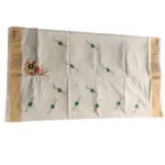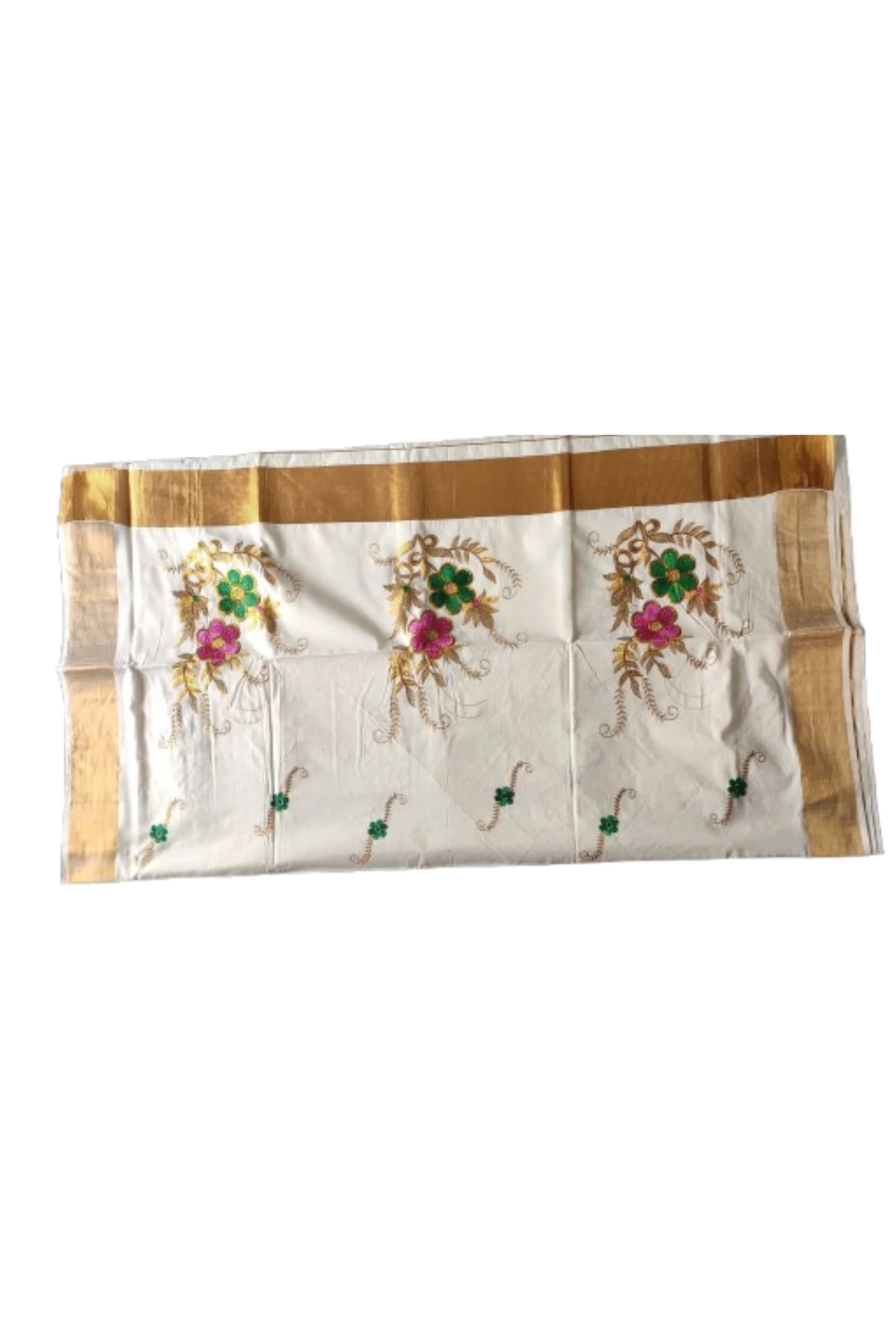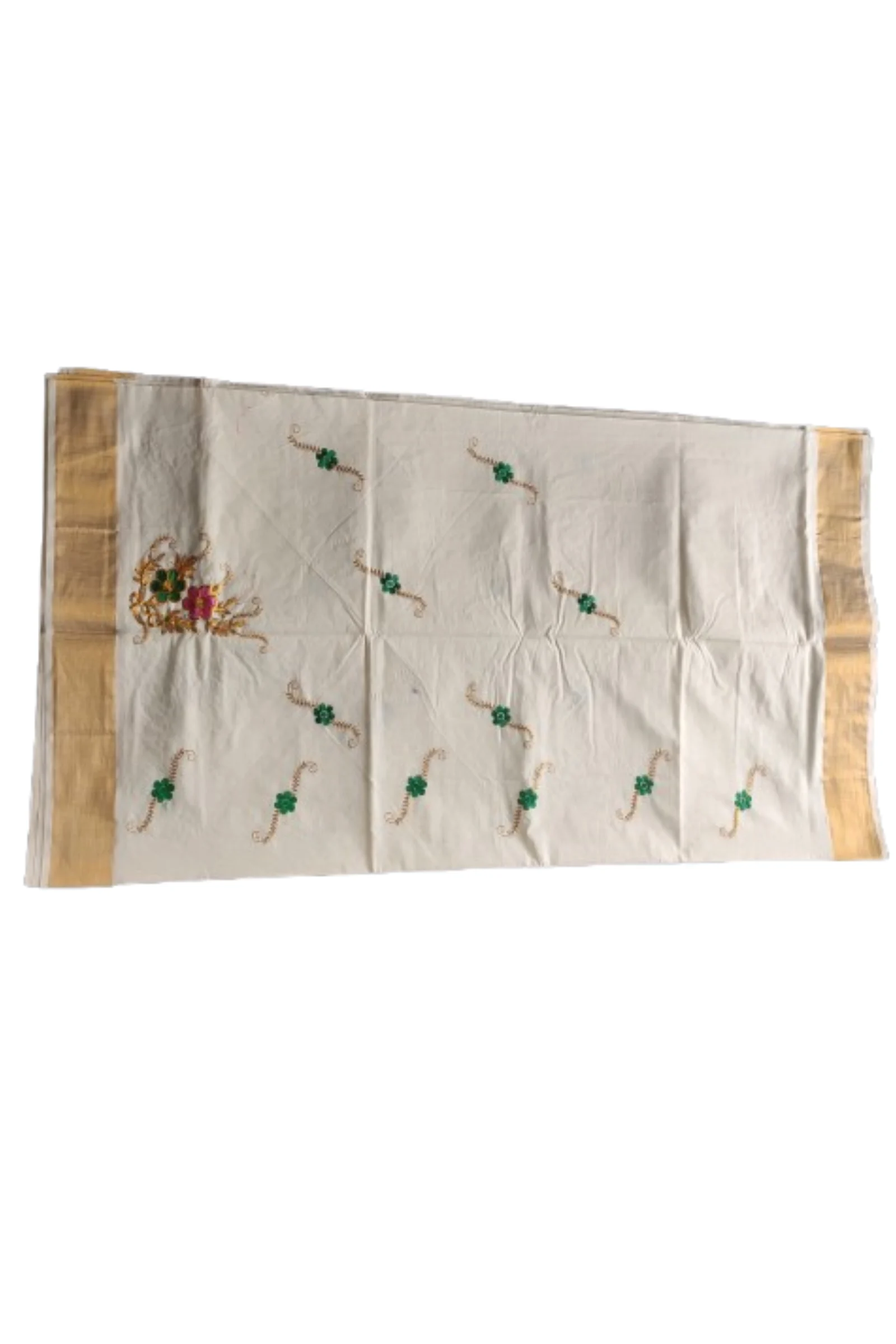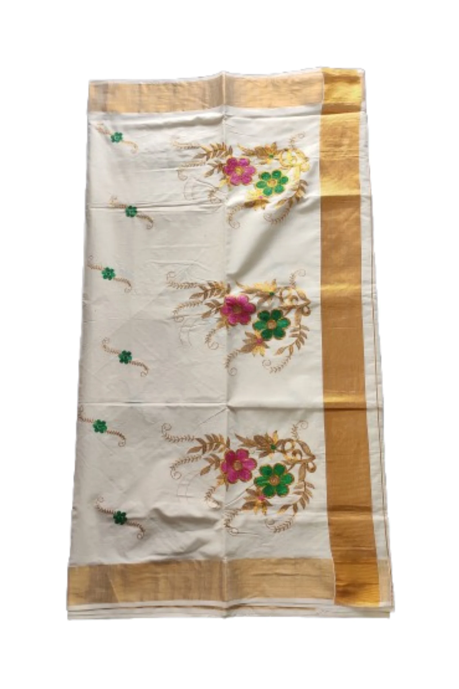 This saree features a beautiful green and rose flower embroidery design, carefully crafted with gold zari thread, which enhances the elegance of the saree. The floral embroidery adds a vibrant touch to the traditional off-white Kasavu fabric, making it both classic and stylish. The rich gold Kasavu border further elevates the beauty of the saree, giving it a luxurious and festive appearance.