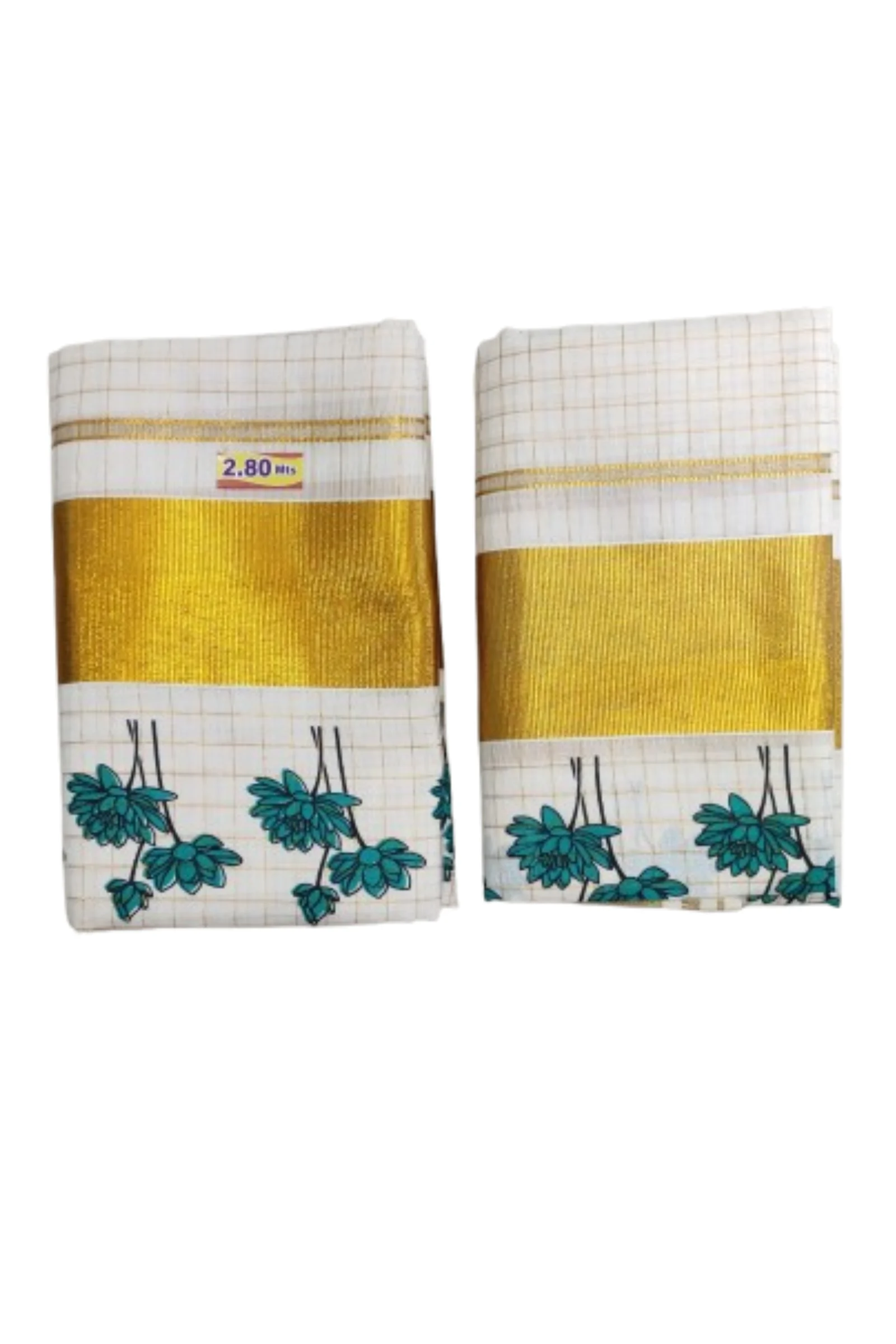 Kerala Kasavu Cotton Checked And Printed Set Mundu Blue Colour