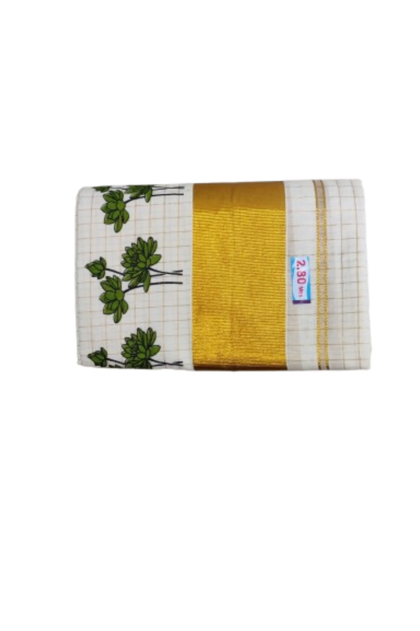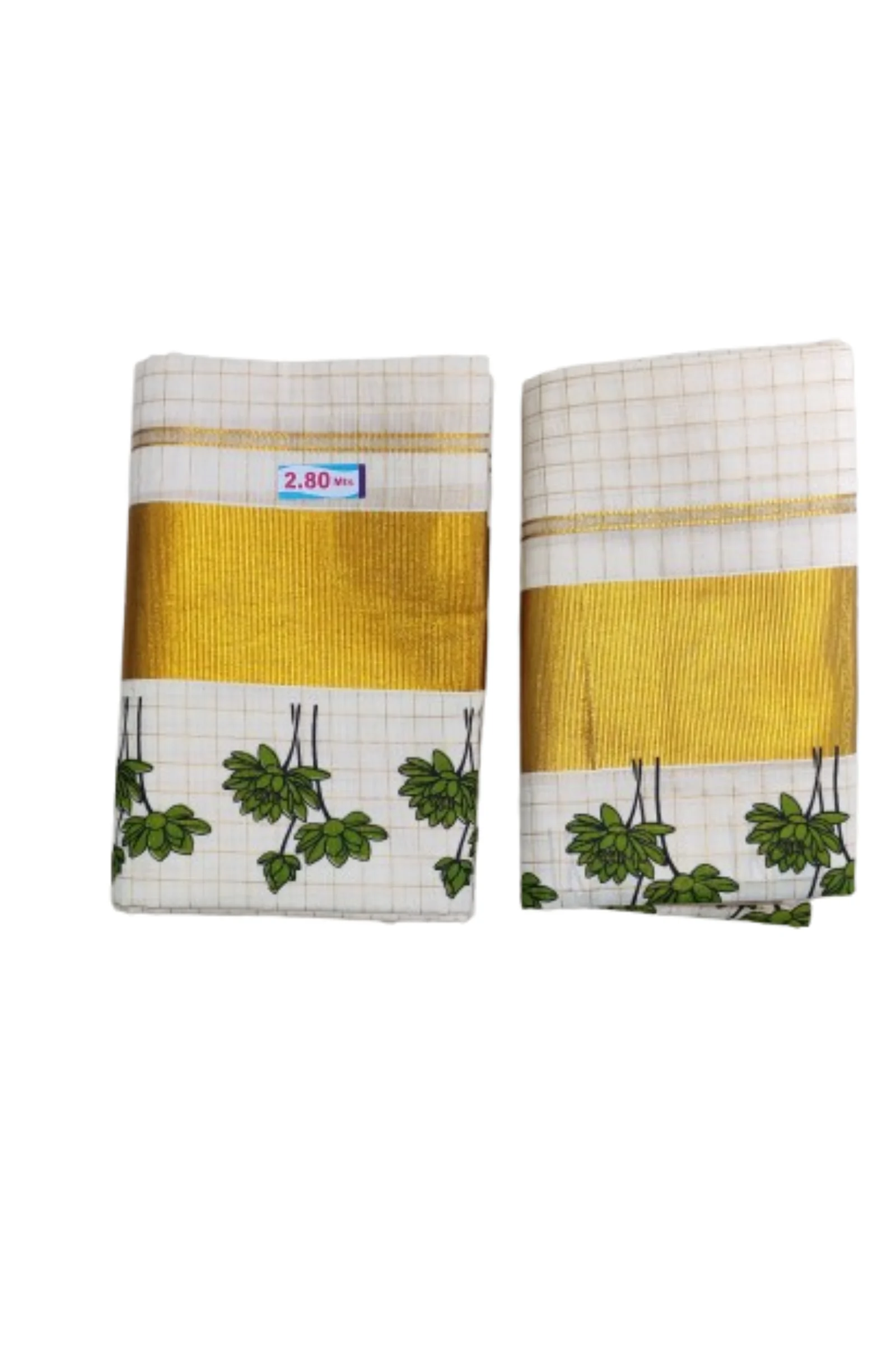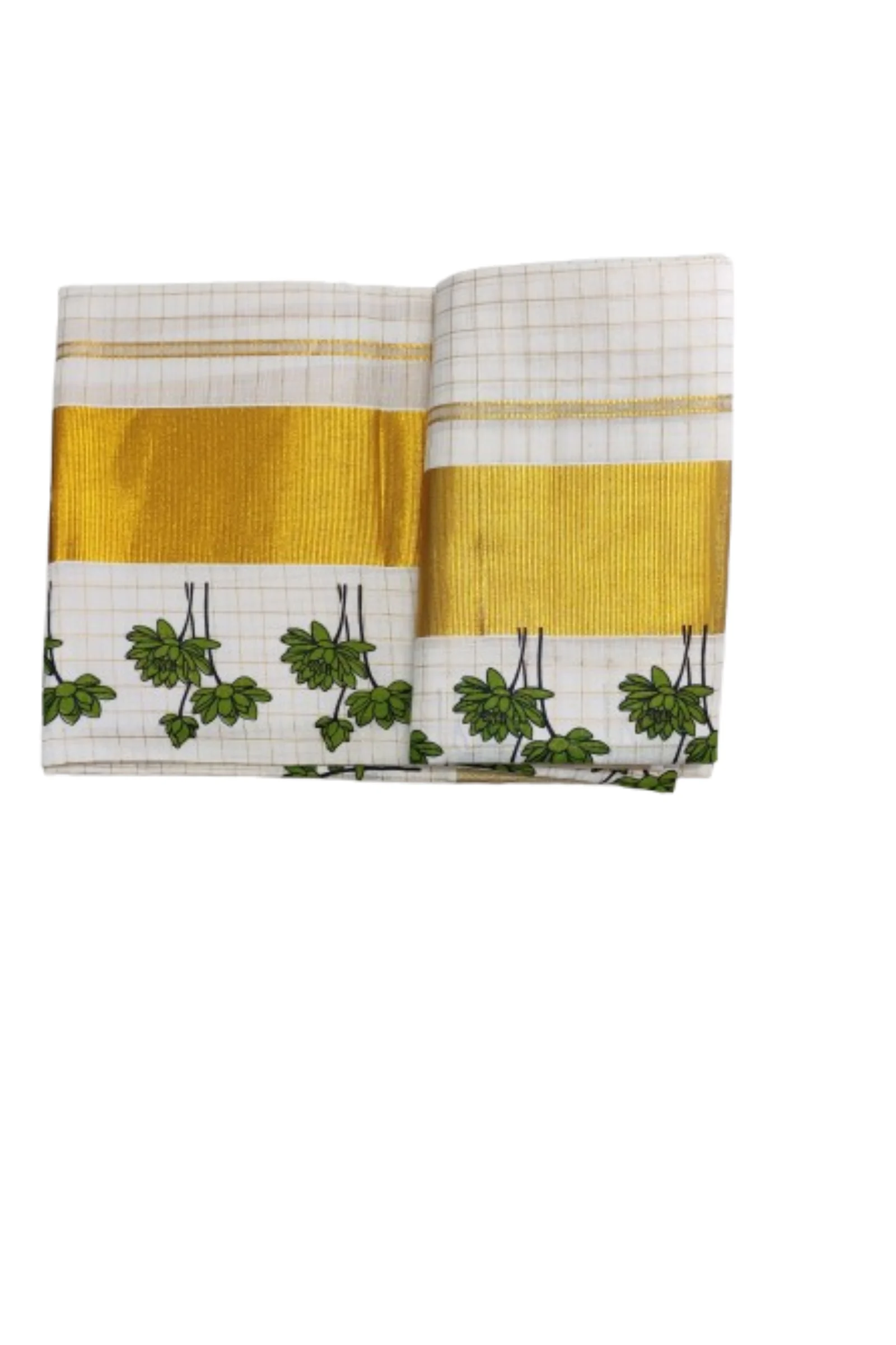 Kerala Kasavu Cotton Checked And Printed Set Mundu Green Colour