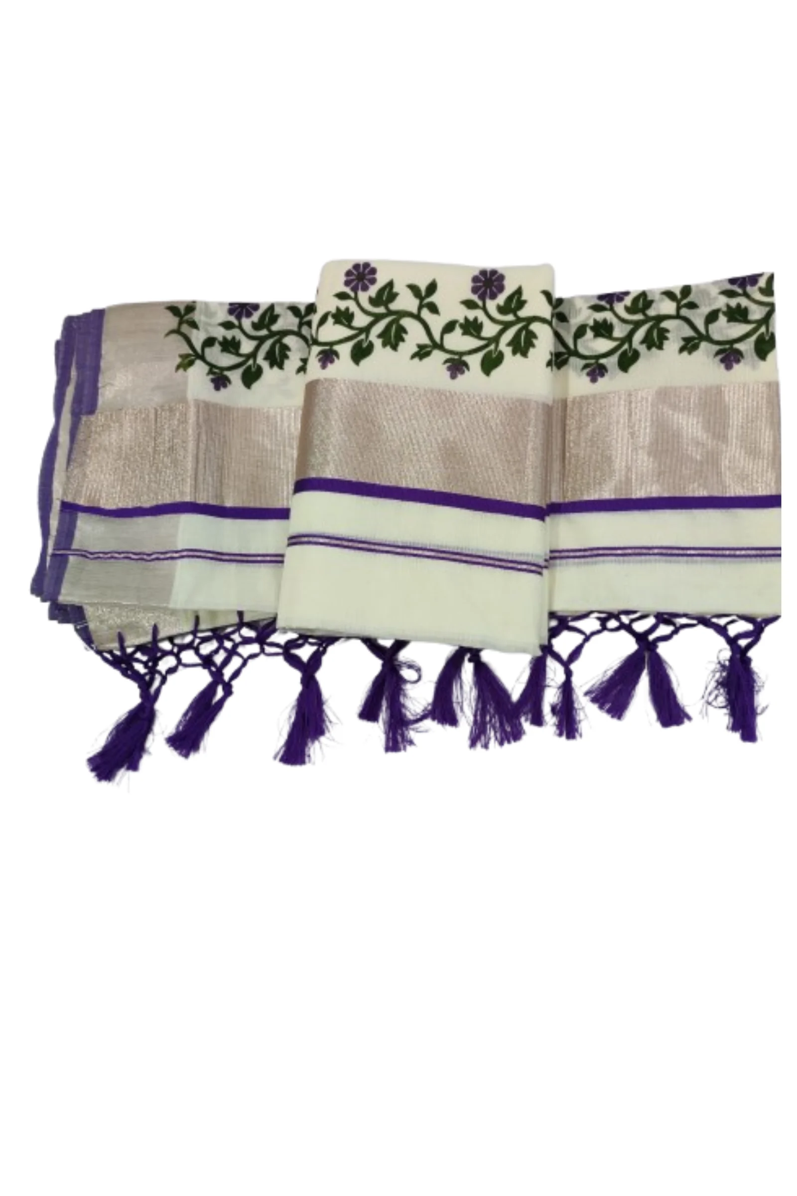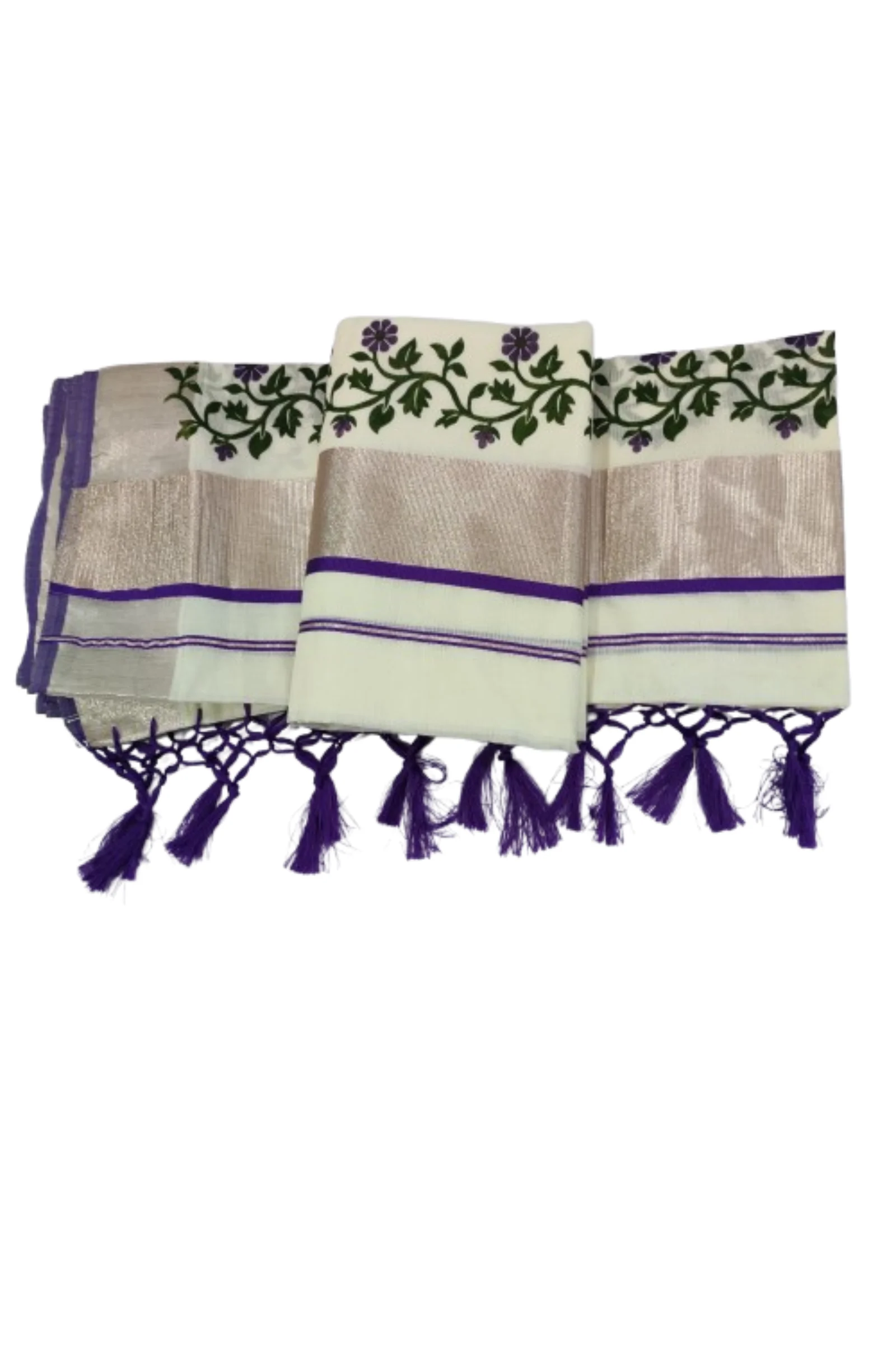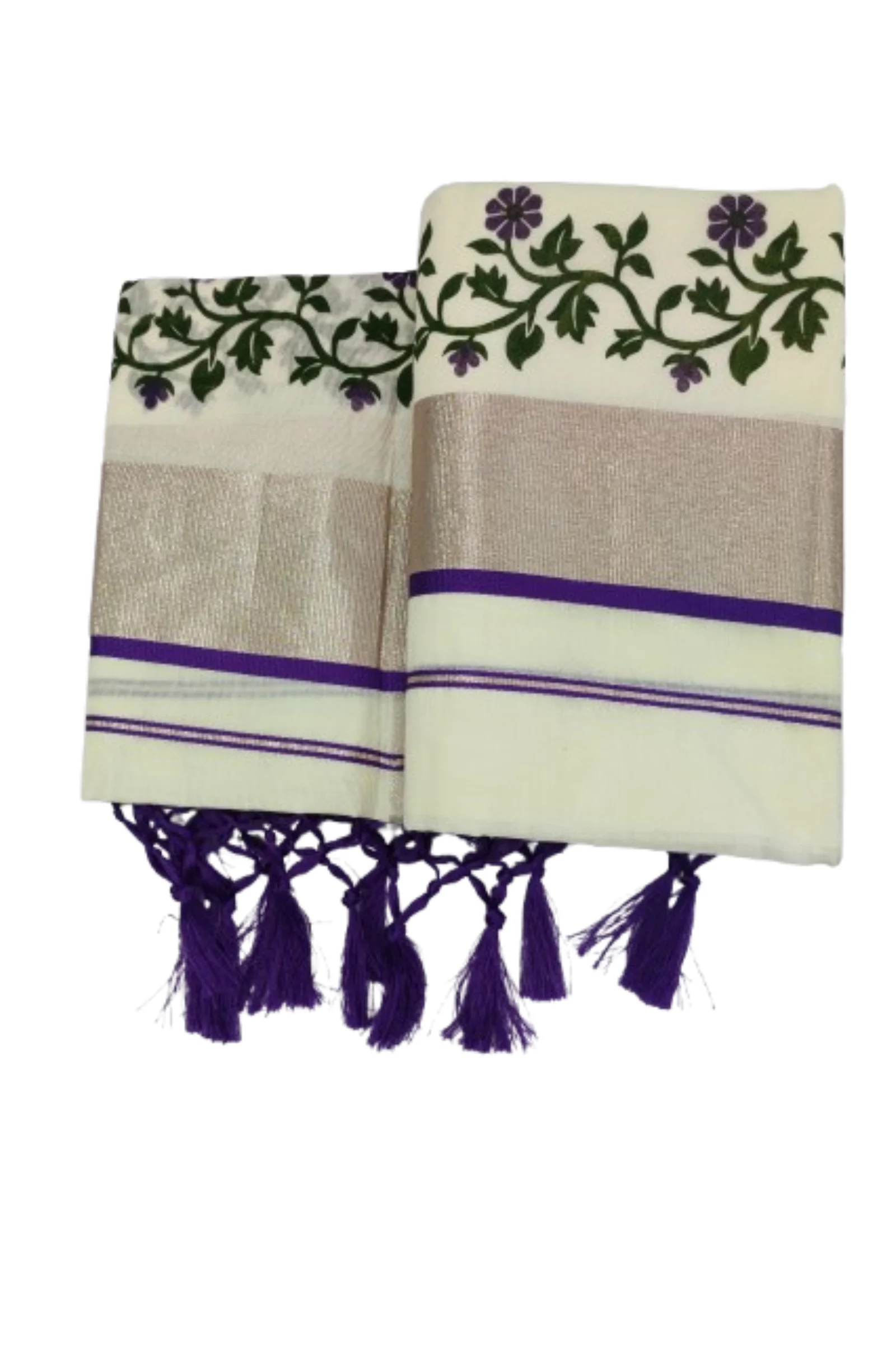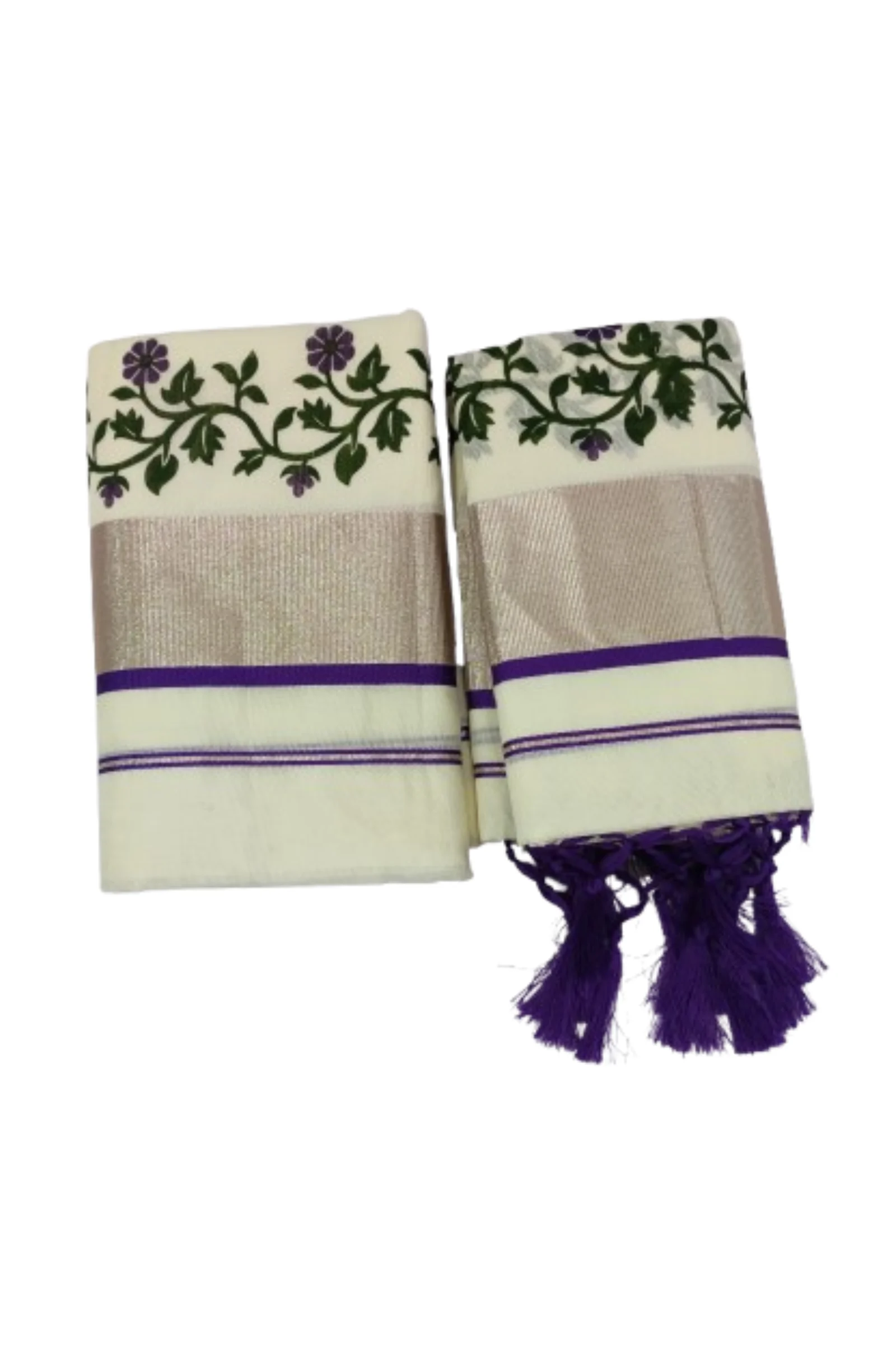 Kerala Kasavu Cotton Print Set Mundu (Purple Color)