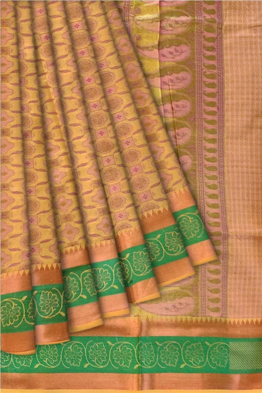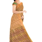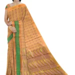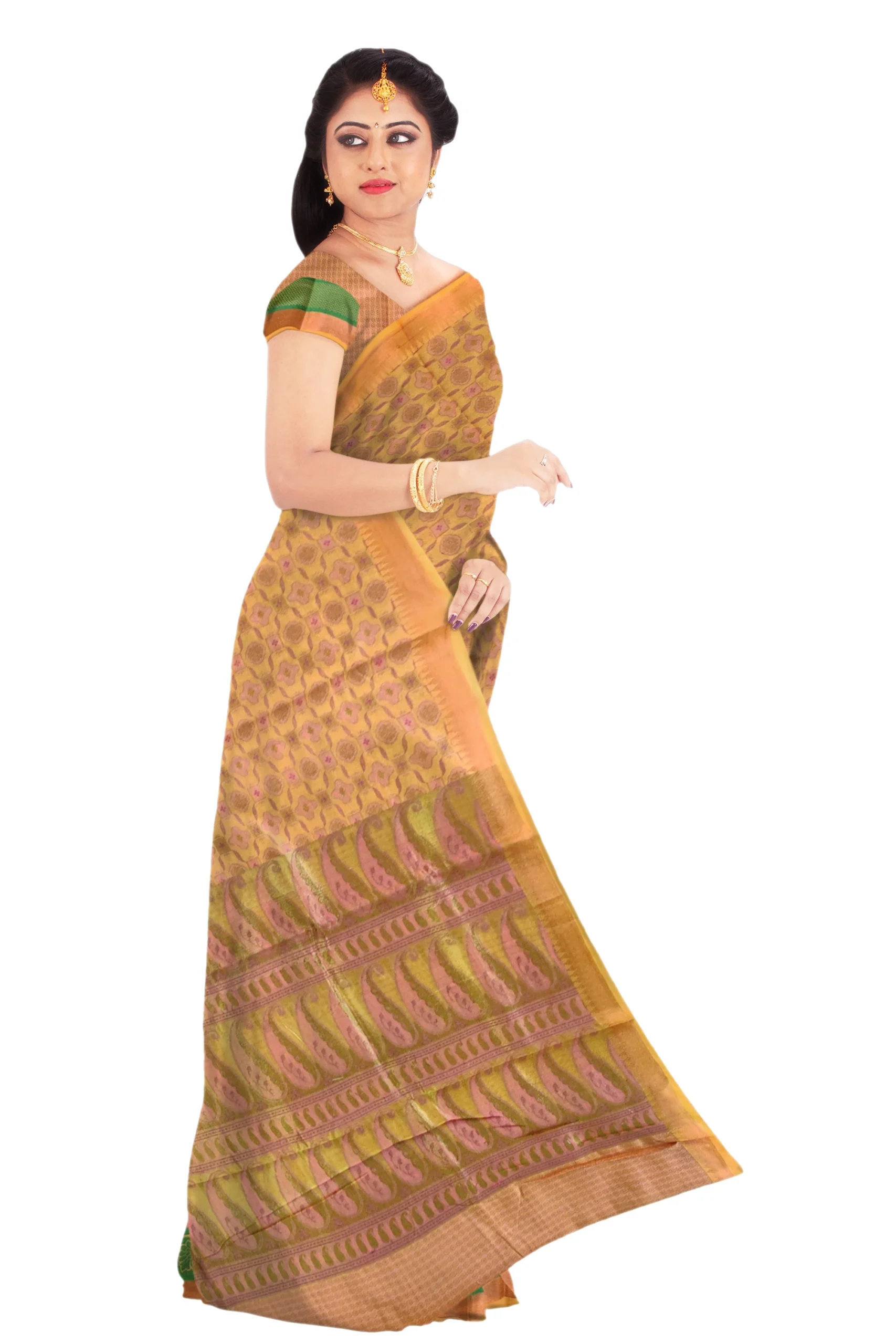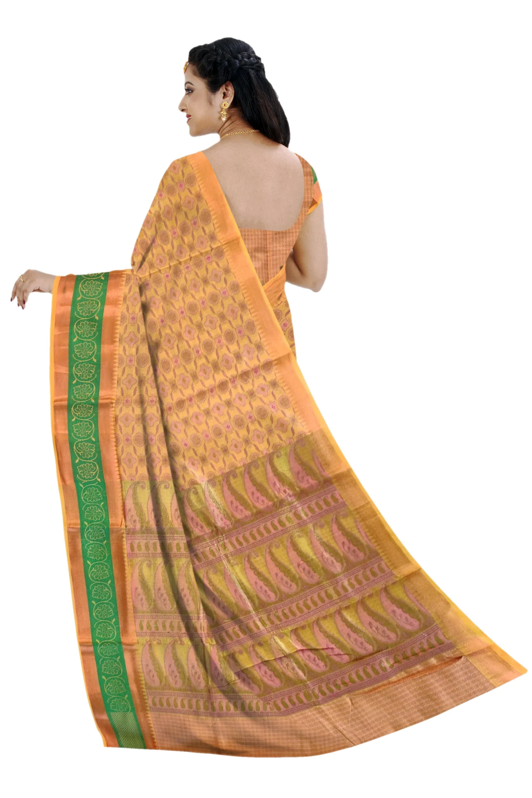 A Malmal cotton saree in golden color comes with a running blouse and features a green color border with intricate flower design. The saree length is 5.5 meters, and the blouse length is 0.80 meters. Malmal cotton is known for its soft and lightweight texture, making this saree suitable for daily wear or special occasions. The golden color of the saree adds a touch of luxury, while the green floral border brings in a fresh and vibrant element.