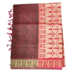 The highlight of this saree is its striking red and rose colored mixed pallu, which adds a bold and eye catching contrast to the green and pink body. The pallu is adorned with intricate woven patterns that reflect the richness of traditional South Indian craftsmanship. These designs enhance the overall appeal of the saree and give it a premium and elegant finish.