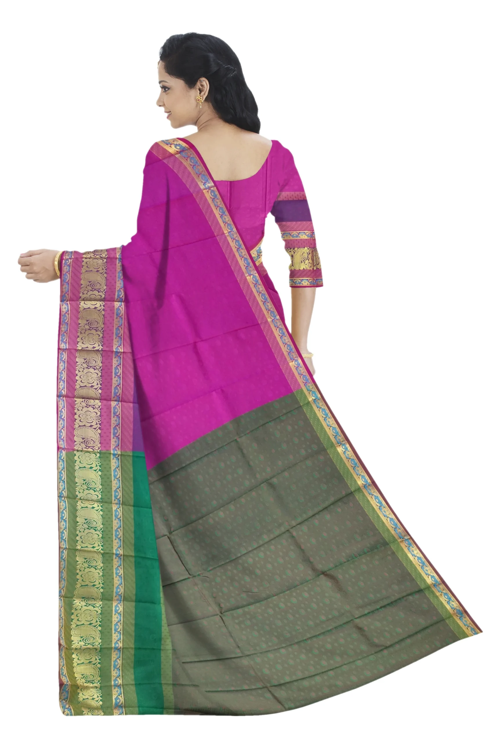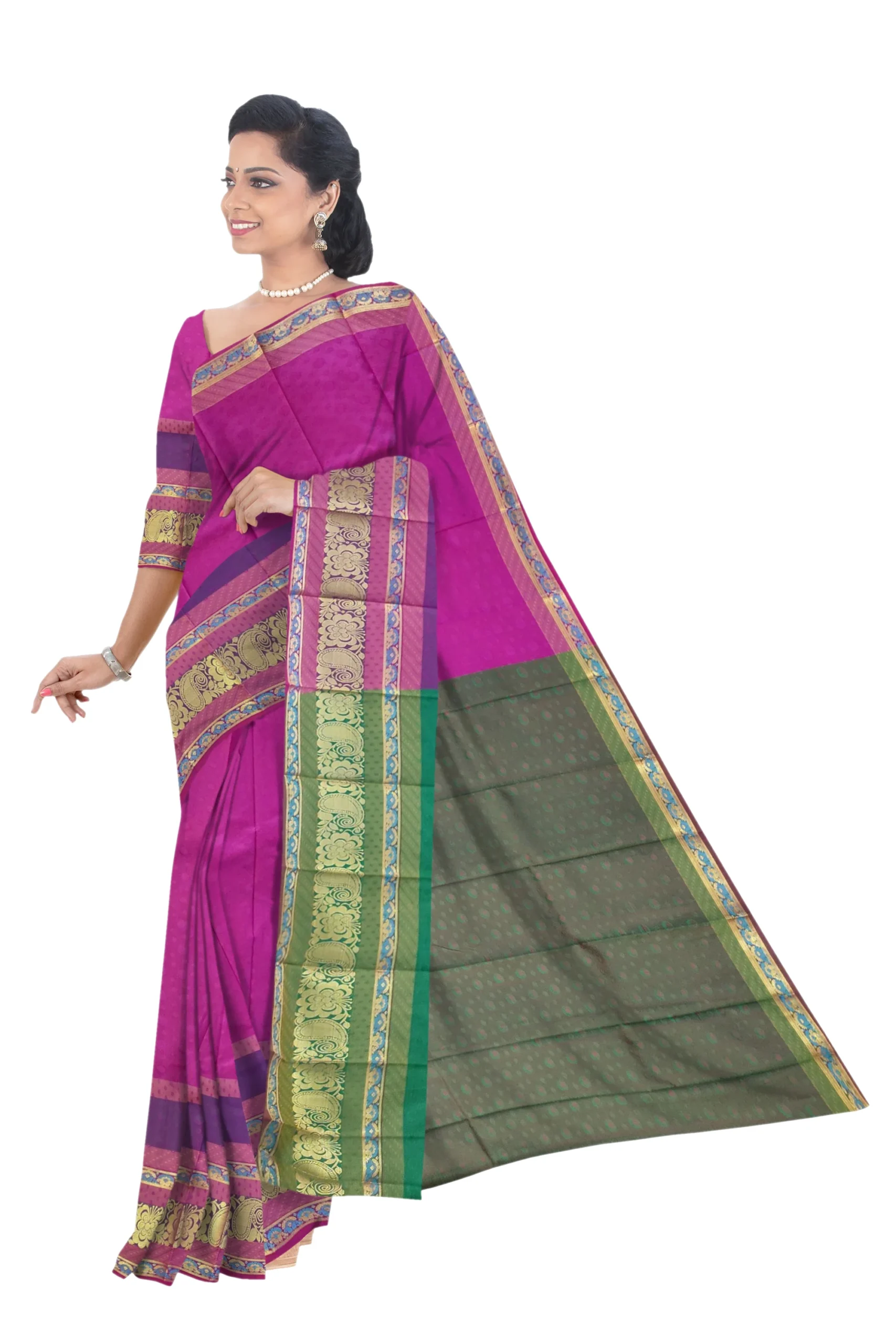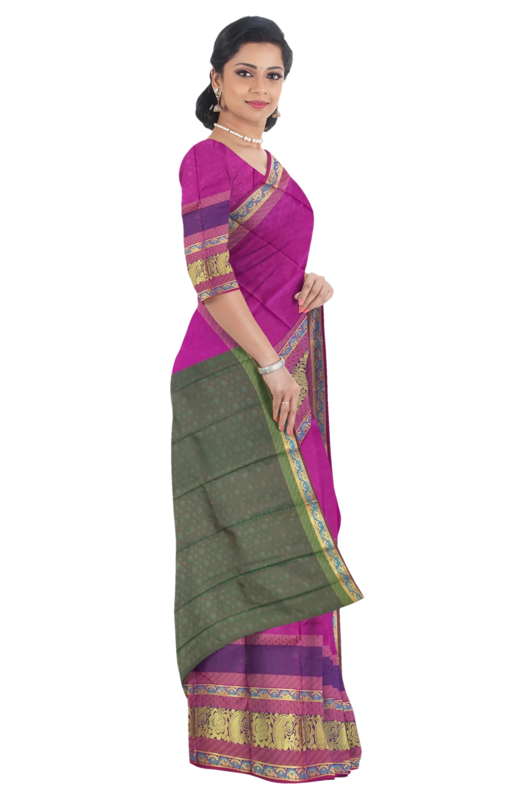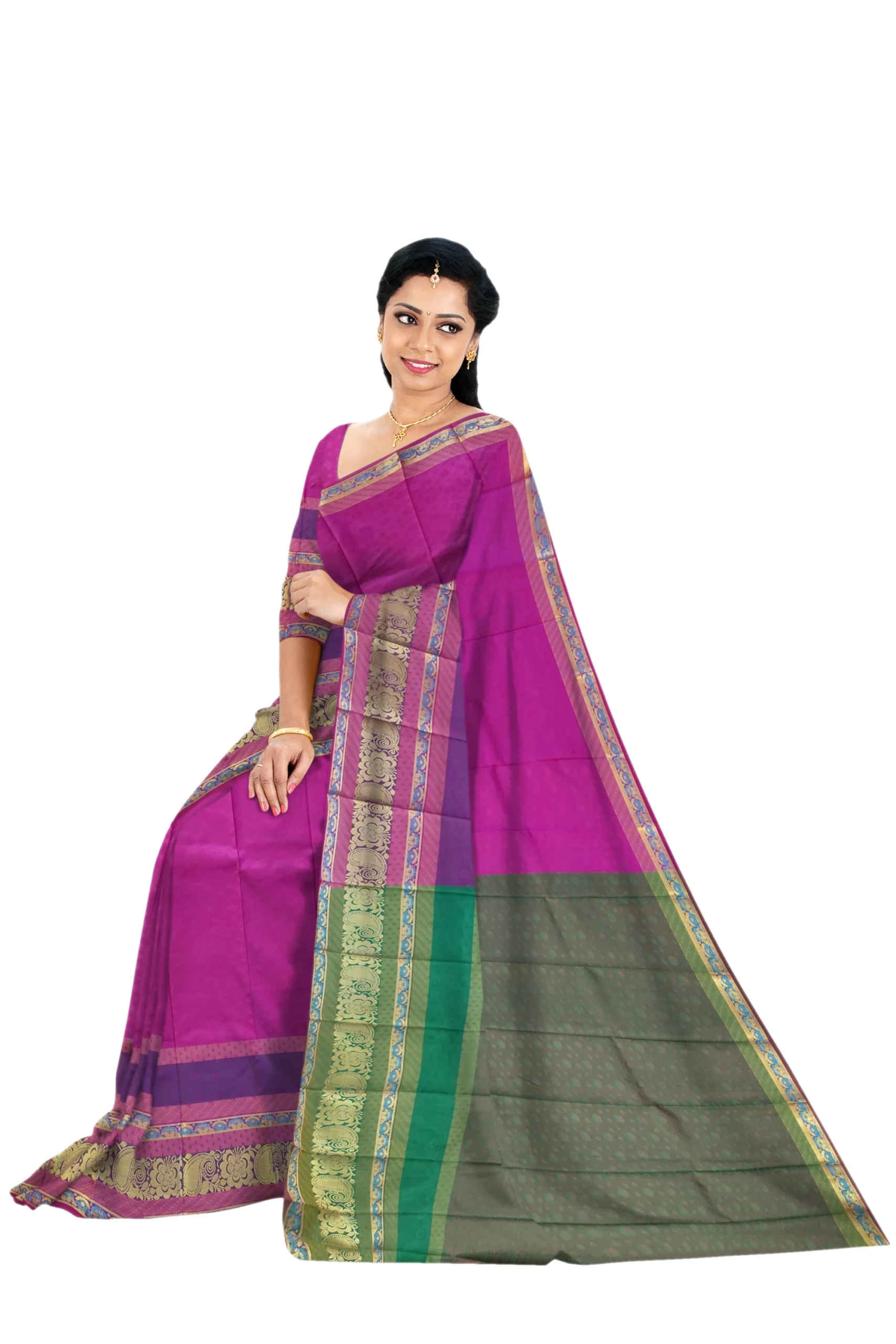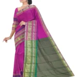 A Varanasi Pattu soft silk saree in rose color features an attractive zari border with mango and batterfly design. The saree has a full attractive design, showcasing intricate patterns and craftsmanship. It comes with a running blouse, making it a complete and stunning ensemble. The purple color of the saree is rich and regal, while the zari border brings in a luxurious and eye-catching element.