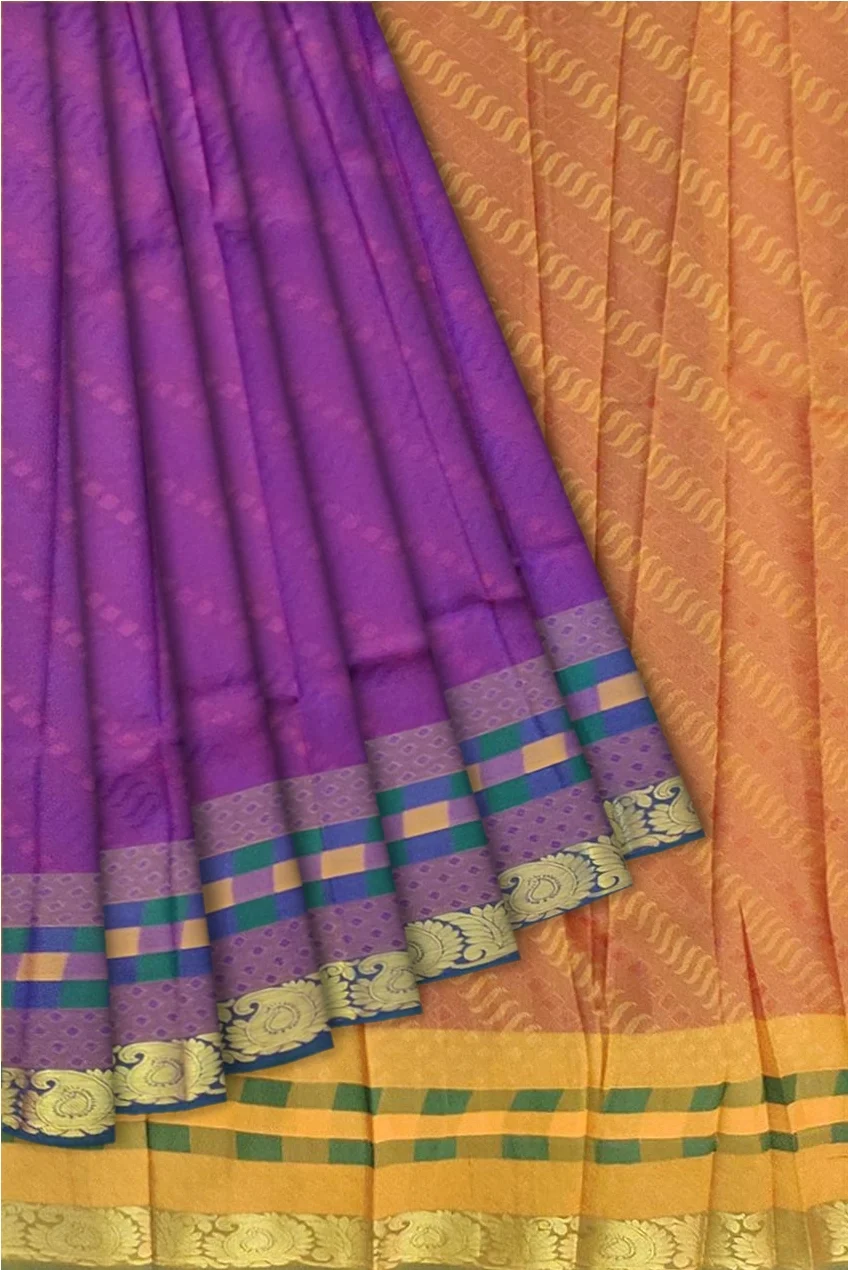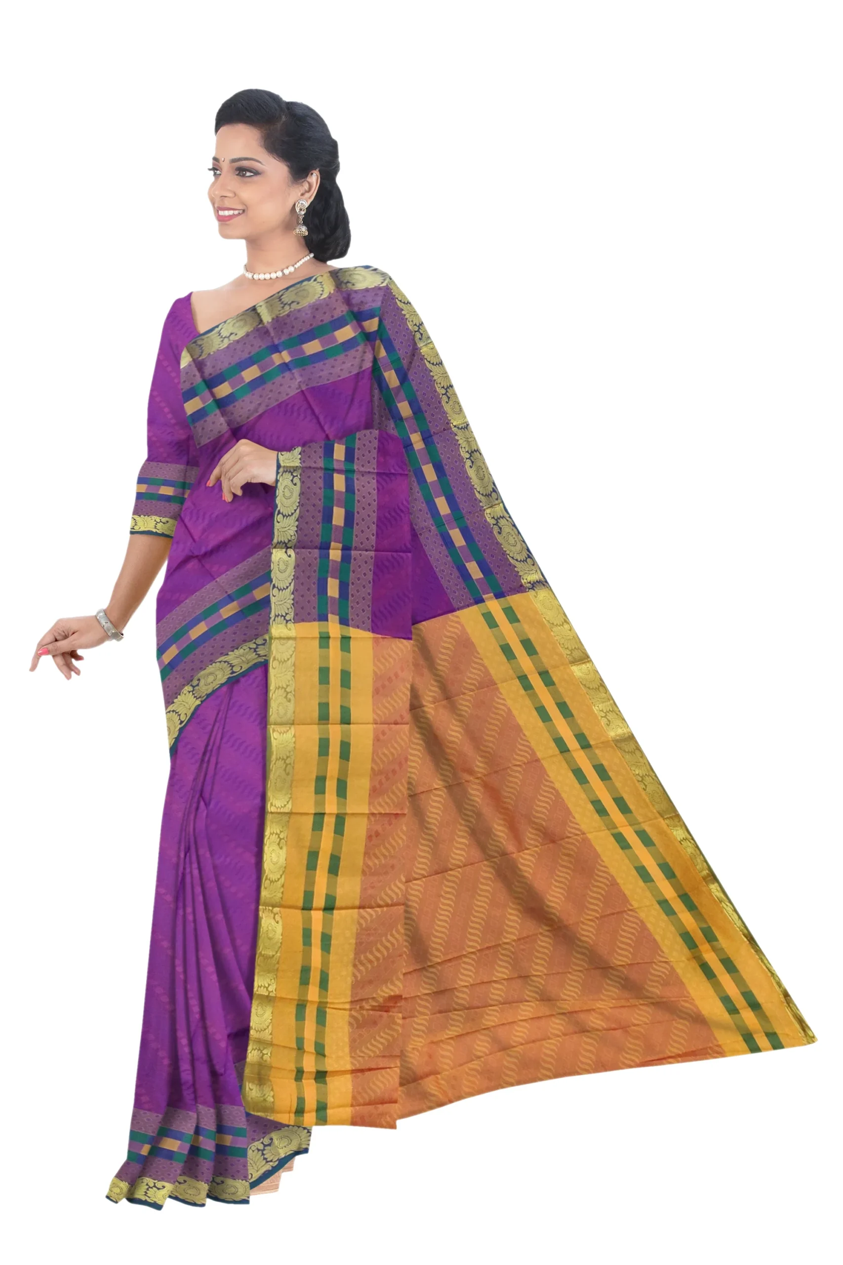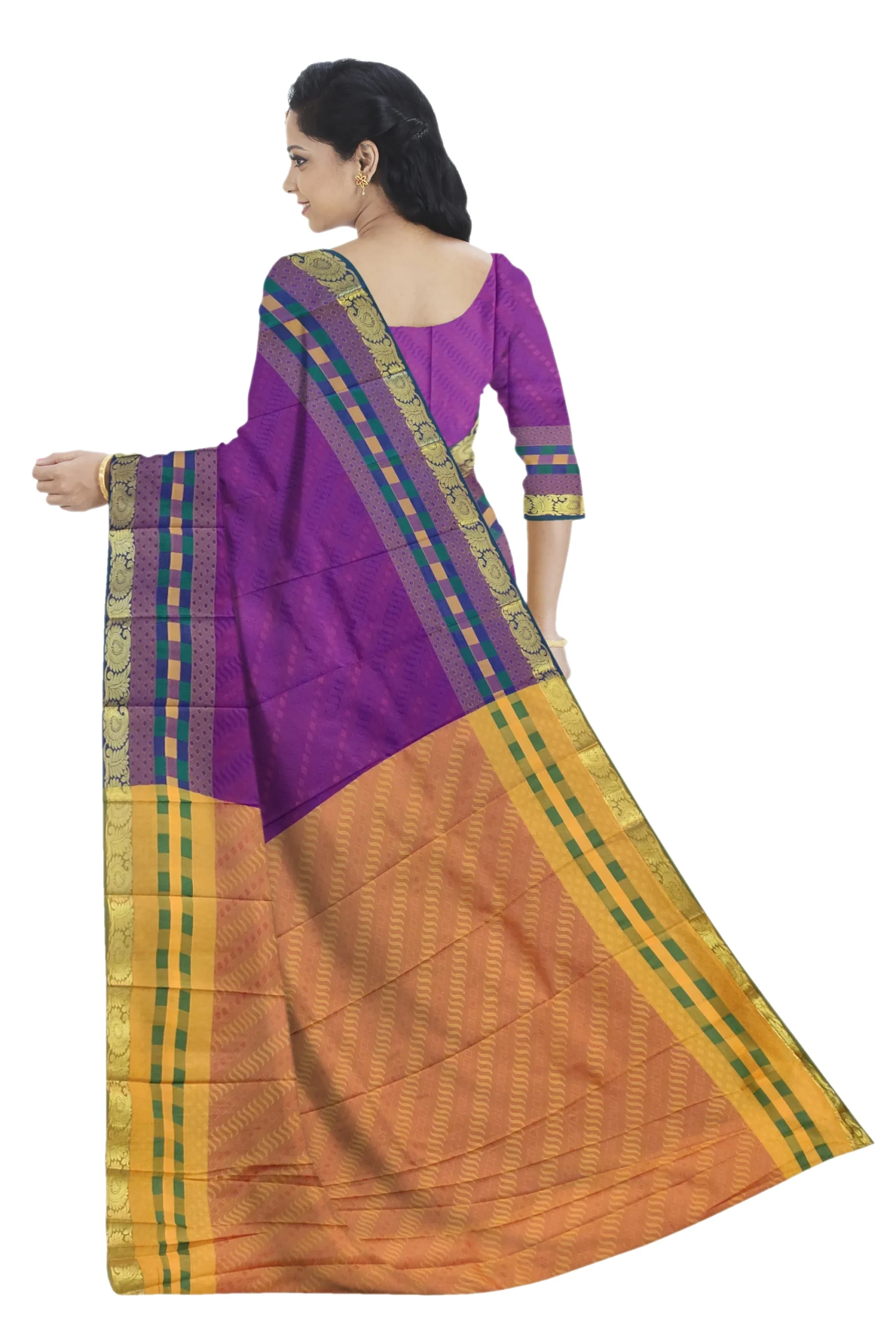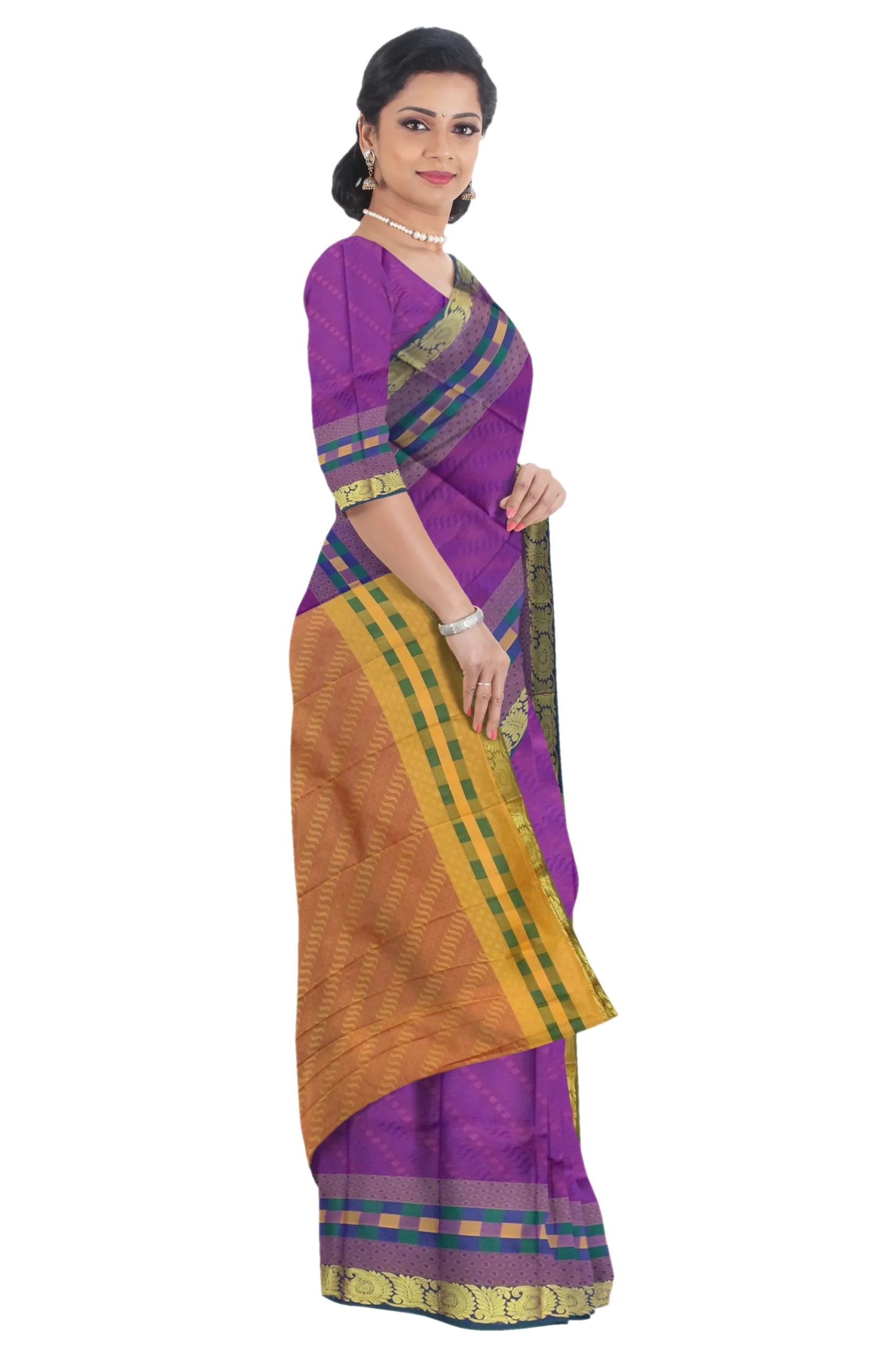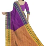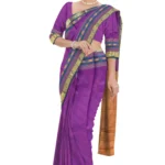 This saree comes in a stunning royal purple colour, a shade that symbolizes elegance, royalty, and grace. Purple sarees are always admired for their rich appearance and versatility. Whether you are attending a family function, festival, temple visit, or special occasion, this saree gives you a graceful and attractive look.